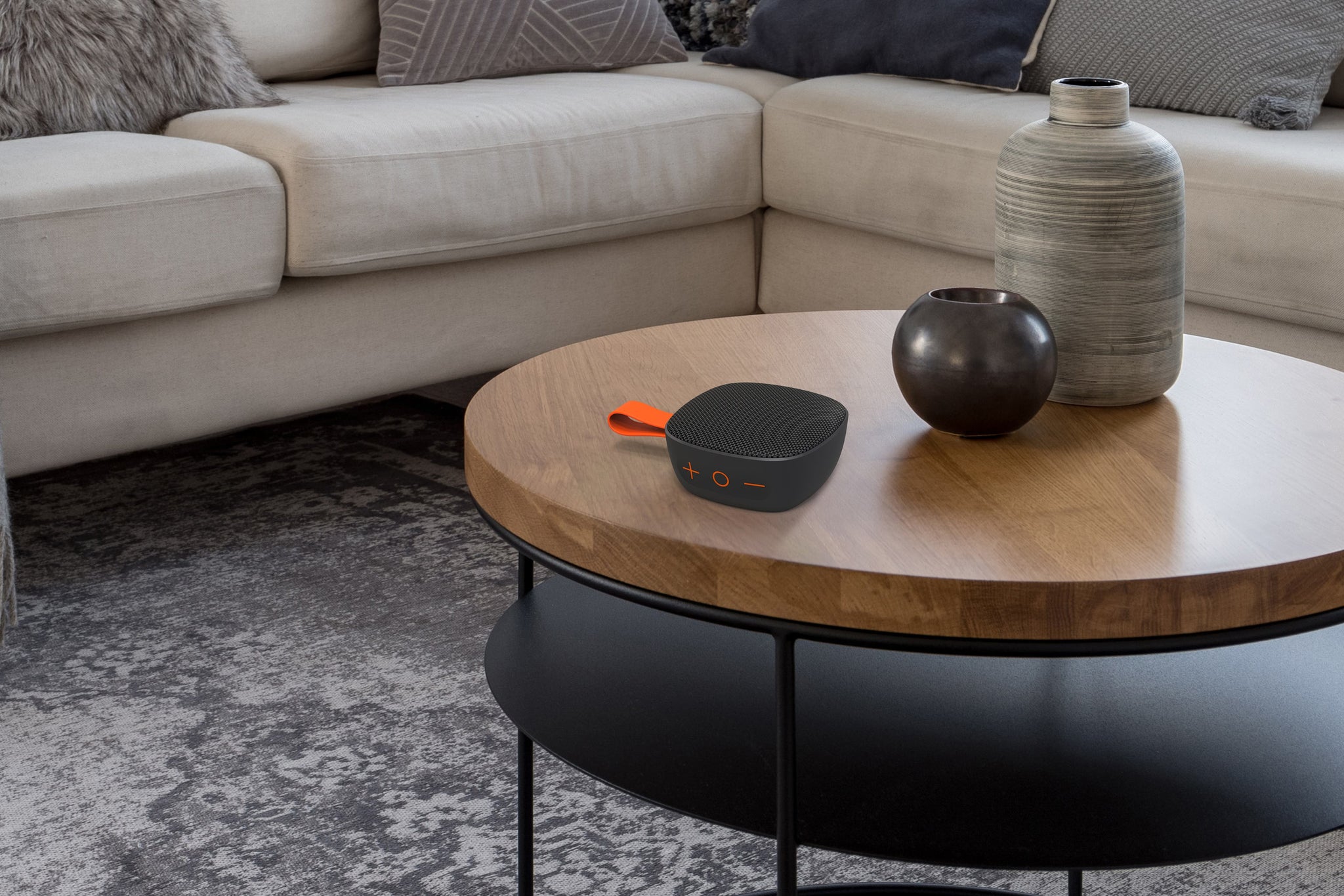 With its compact and lightweight design, this ultra-portable small speaker can easily fit in a pocket or be packed in a bag and taken on any adventure day or night. Plus, it has a strap that can be hung up anywhere or attached to bikes, backpacks, trees, railings and more.