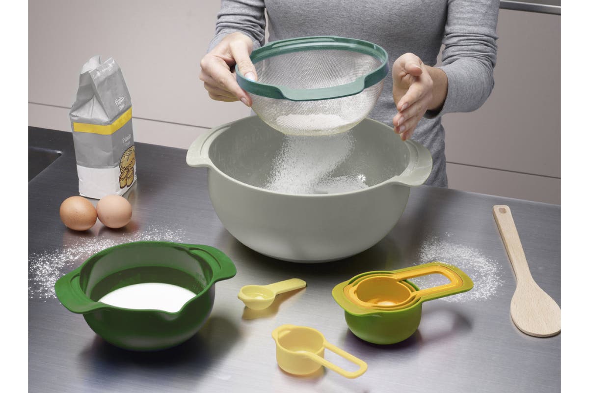 - Set includes 4.5L mixing bowl, 3L colander, 1.65L sieve, 0.5L mixing bowl and 5 measuring cups