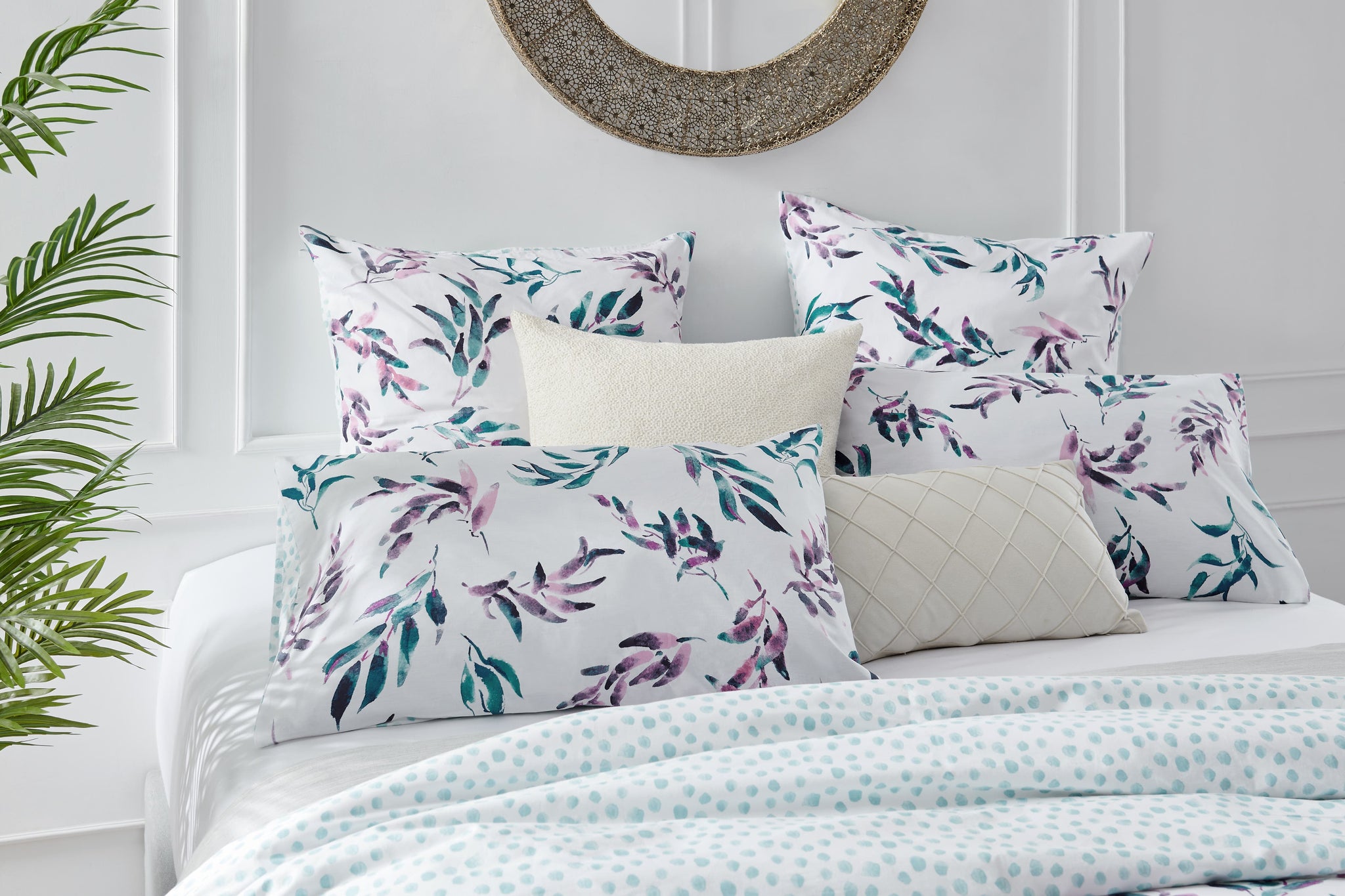 Featuring a beautiful motif in deep greens, refined pinks and purples, this stunning modern design will refresh your bedding, adding a pop of colour.