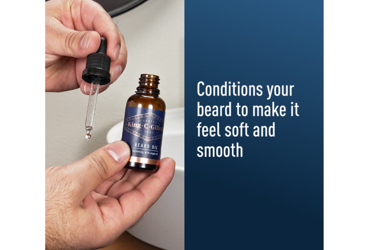The King C. Gillette Men’s Beard Oil is designed to soften coarse beard hair. It easily absorbs into beard hair, leaving it feeling soft and conditioned all day long.