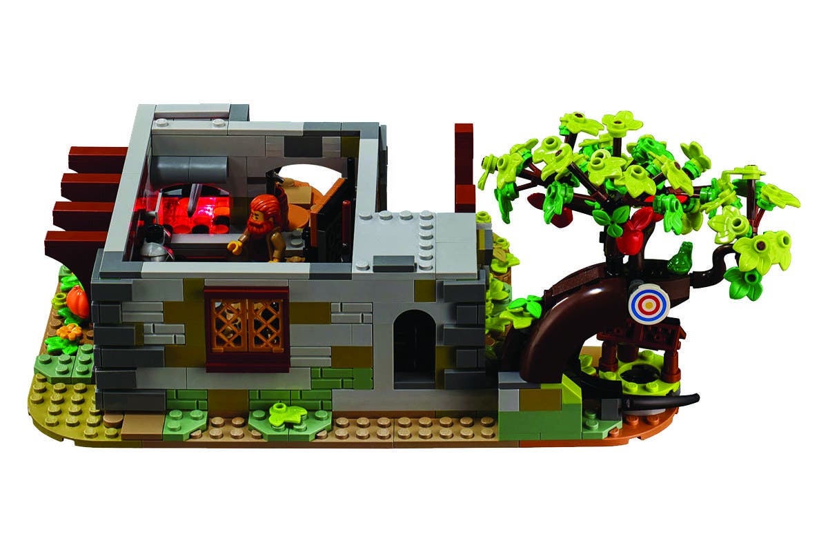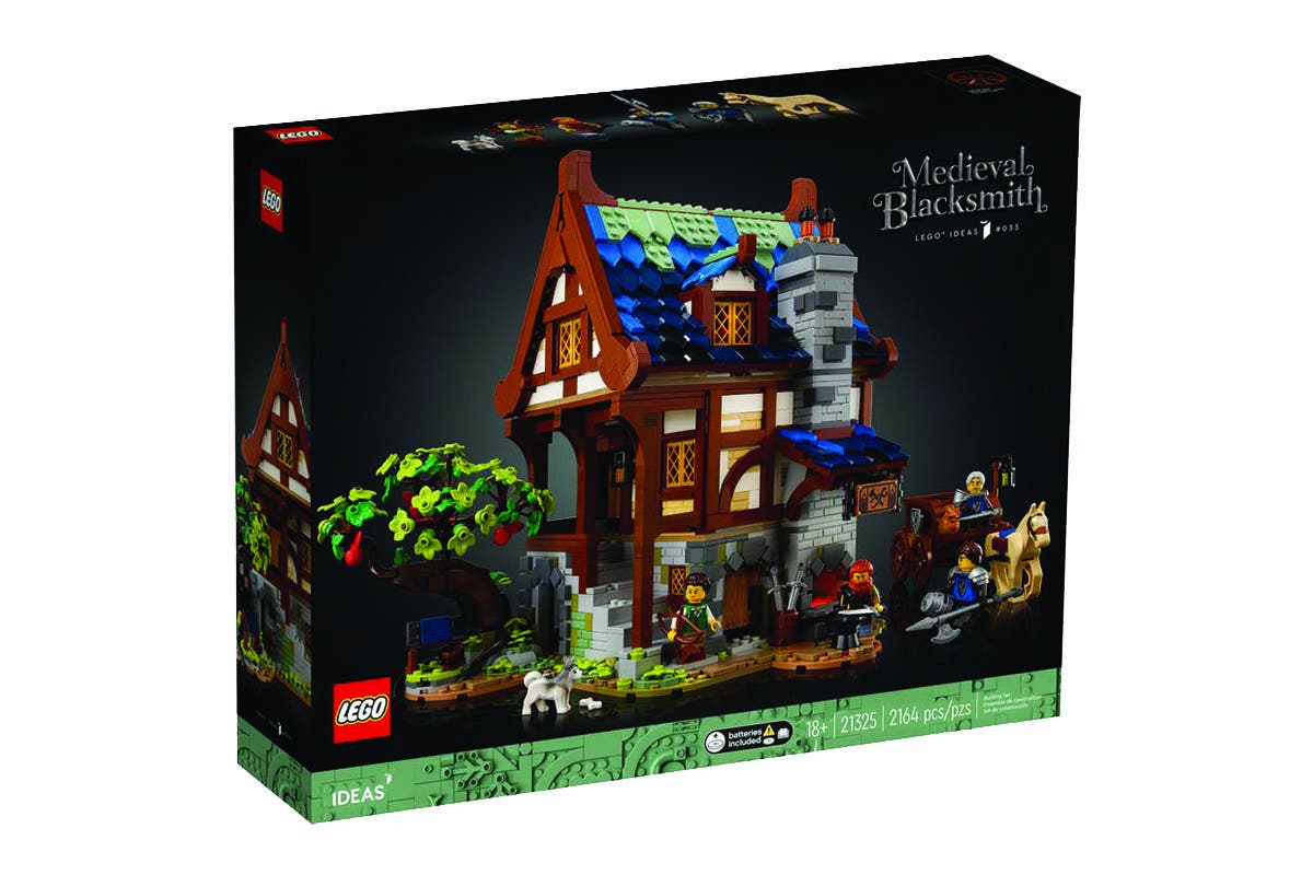 Bring the Middle Ages to life with the LEGO IDEAS Medieval Blacksmith. The roof and top 2 levels lift off for easy viewing of the fully furnished bedroom and kitchen, plus a workshop that is packed with items you’d have seen in a real medieval blacksmith’s smithy. Other features include a glowing forge with a LEGO light brick, plus a garden with buildable models of an apple tree and a well. Minifigures and more there are 4 minifigures to bring the scene to life – a blacksmith, archer and 2 Black Falcon Knights with 4 swords, 3 shields and a halberd, plus a posable horse figure with a buildable cart and dog and treefrog figures.