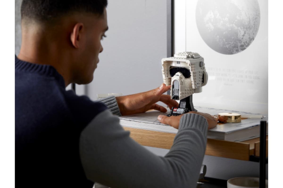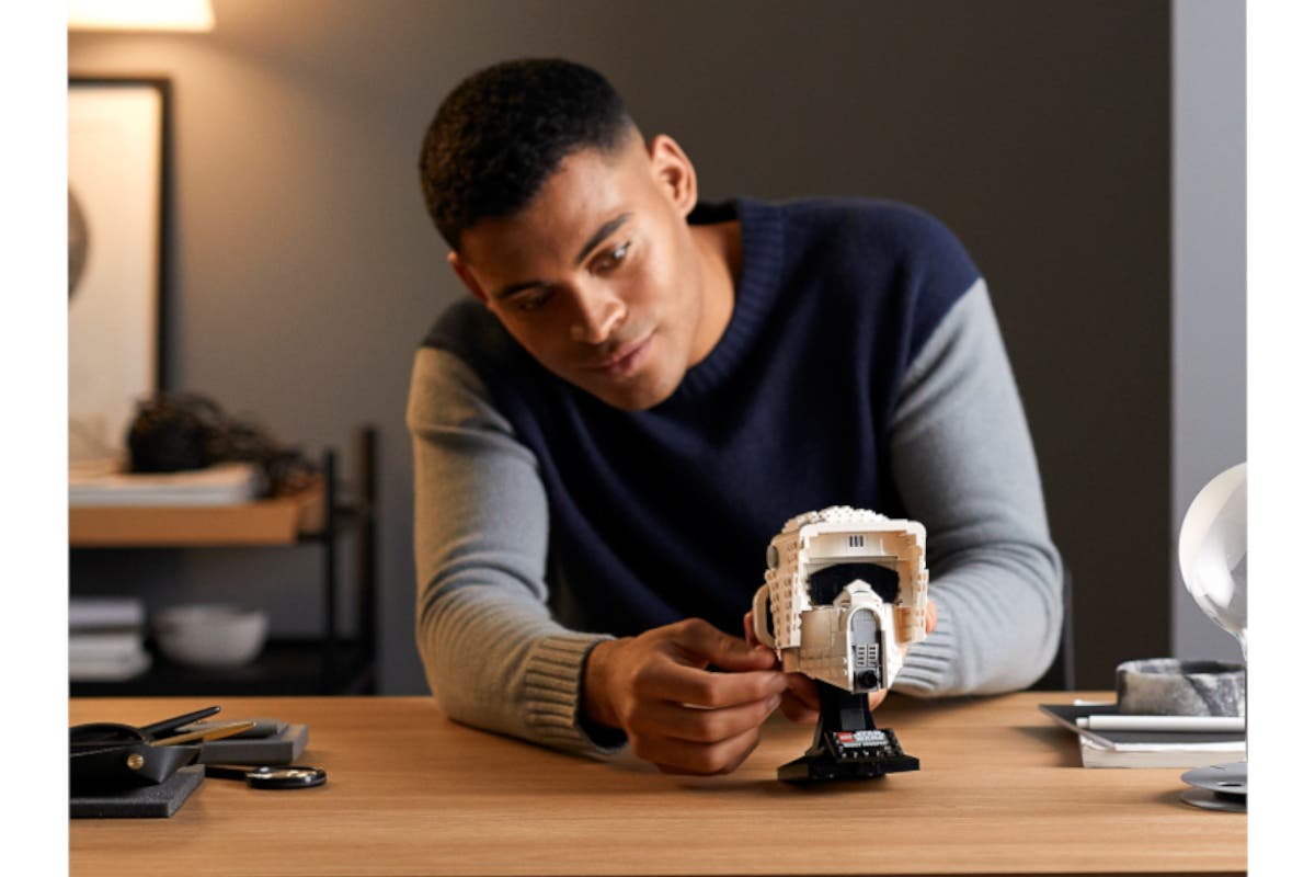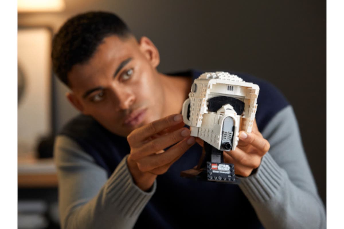 The LEGO Star Wars Scout Trooper Helmet set offering a fun, creative way to unwind, every contour and detail of the helmet is beautifully recreated with LEGO bricks. The distinctive look of a Scout Trooper’s helmet is recreated in LEGO style, inspiring memories of Star Wars saga scenes and the stand with a nameplate completes a cool display piece.