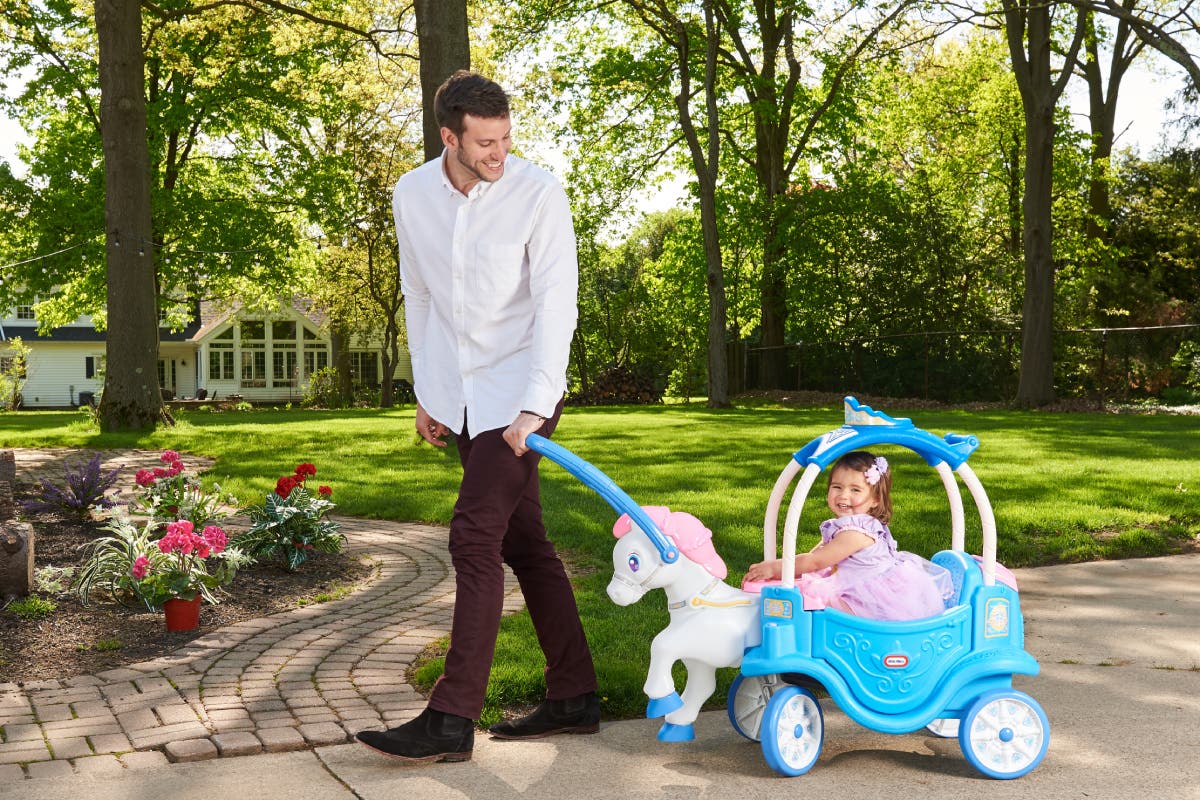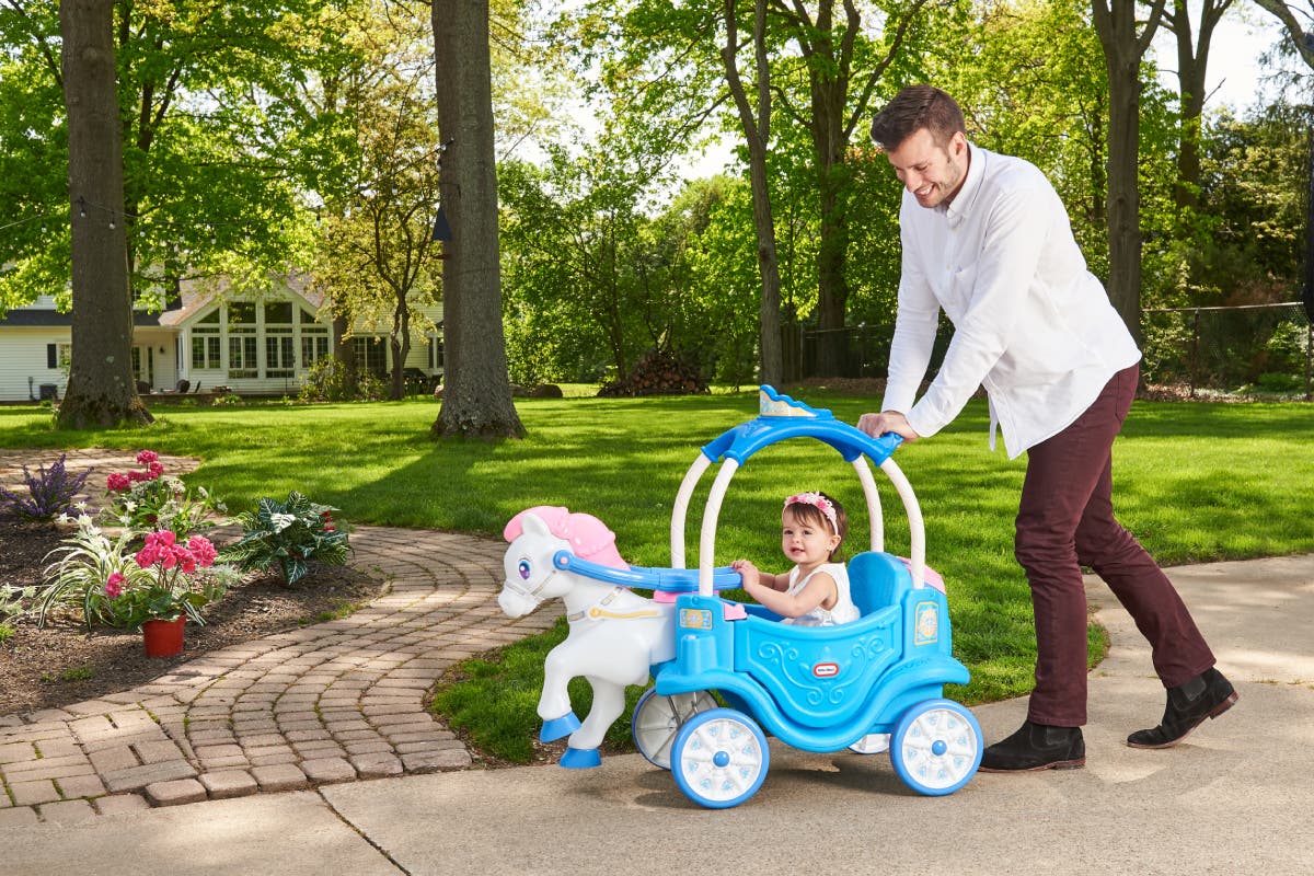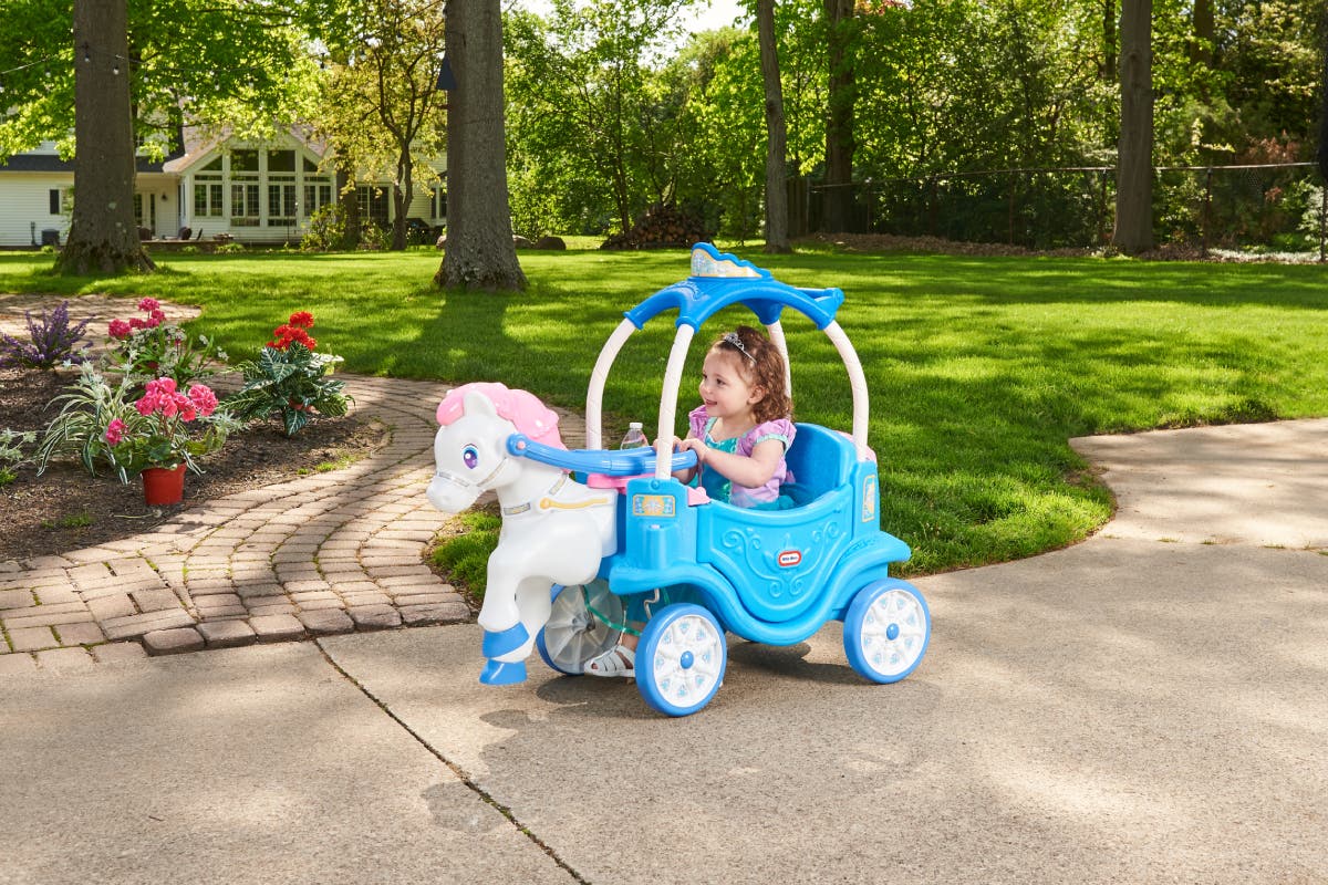 Little girls will beam behind the reins of the Little Tikes Princess Horse & Carriage ride-on. This cosy carriage features colours and styling to please every little princess.