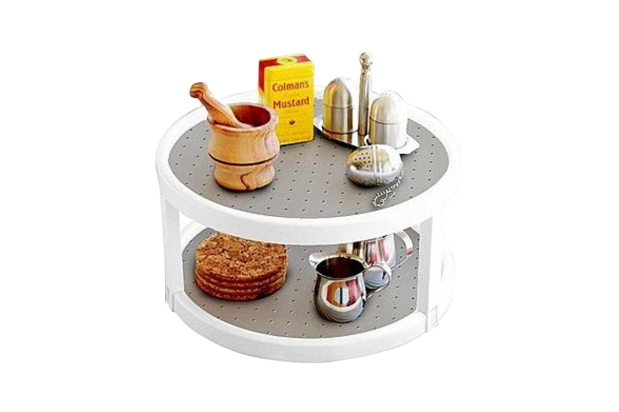 The Made Smart Expandable Twin Turntable, a two-level turntable that allows to easily pick your items. This turntable has a nonslip lining and rubber feet to keep things in place and a wide base to provide stability.