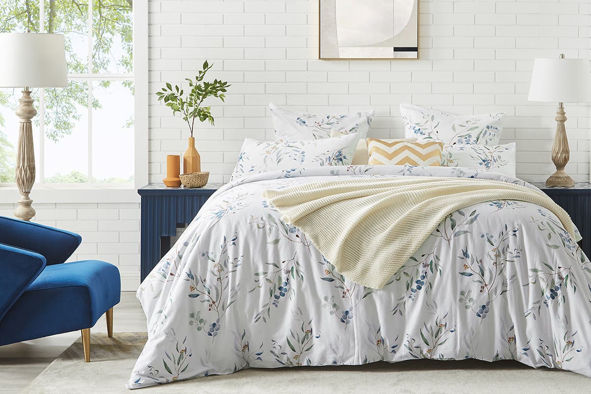 With a sophisticated print inspired by flowering acacia branches on a crisp white base, this quilt cover set perfectly complements a range of bedroom decors and bed sheet sets.