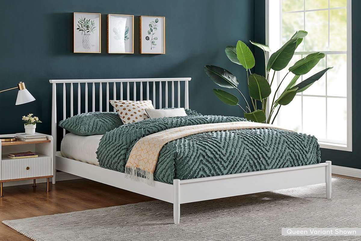 Bring a bright and clean look and feel to the bedroom with a country farmhouse-inspired bed frame with soft lines and a towering, elegant headboard.