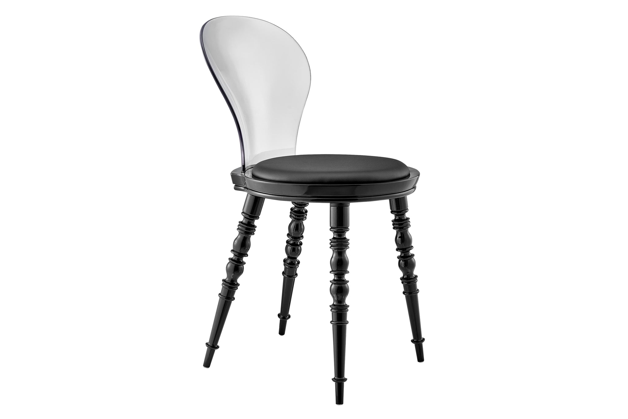 Combining modern elements of minimalist clear backs with mid-century art deco styled legs, this replica chair boasts an unconventional design that will be a feature furniture piece in your lounge or dining area.