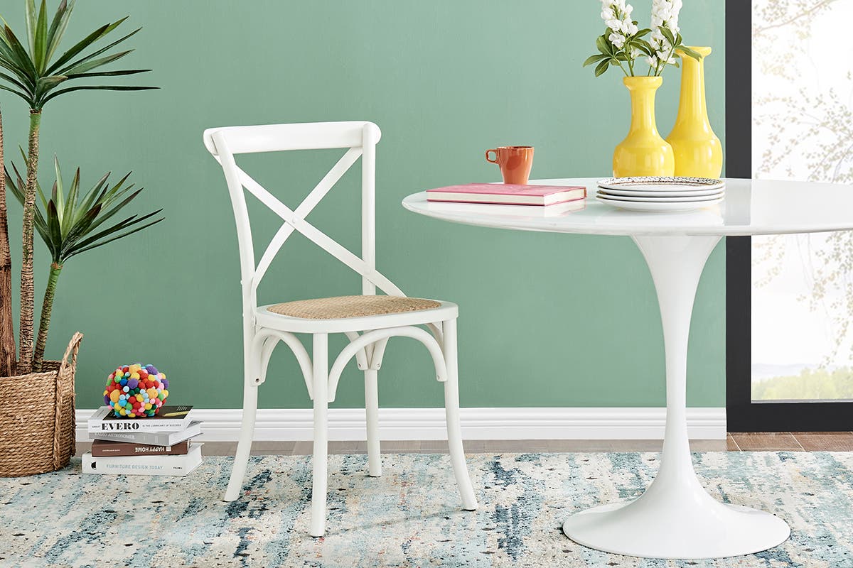 Built from solid birch wood with a clean white finish and a woven rattan seat that offers an eco-friendly and comfortable cushioning, these chairs beautifully master elements of the natural world for a rustic, homely aesthetic.