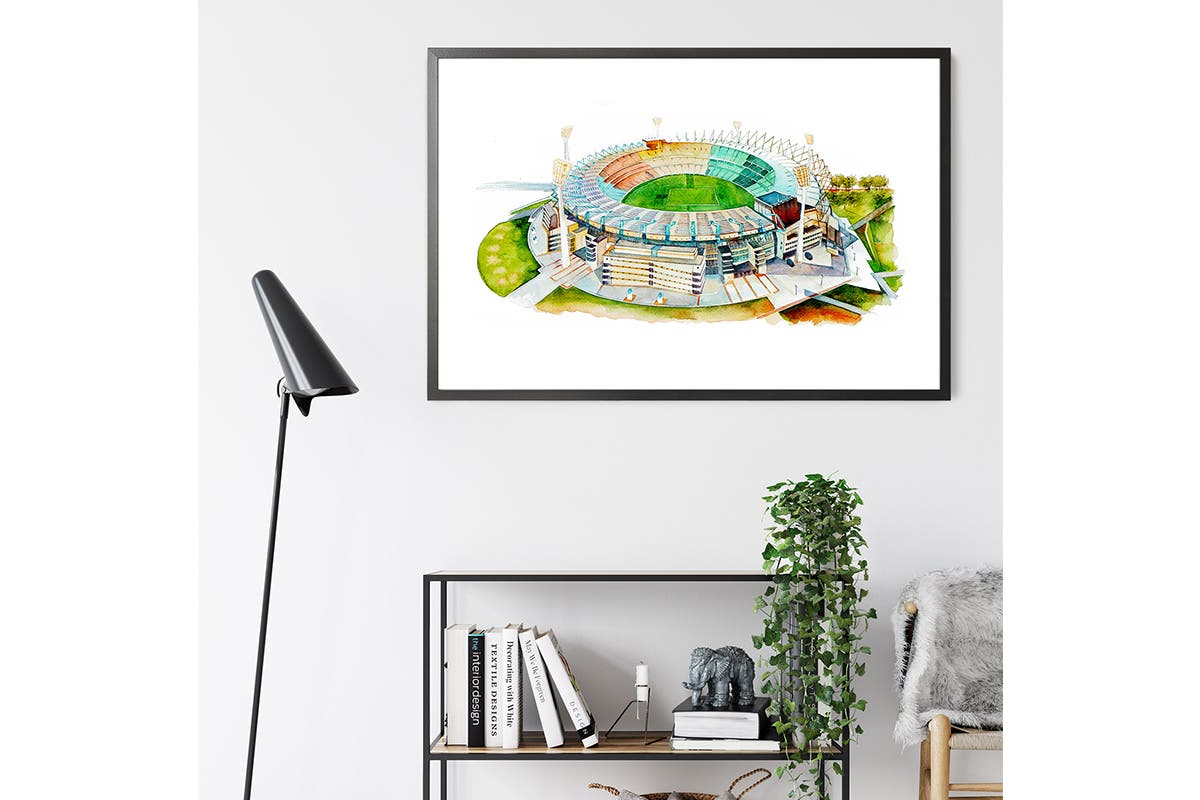 The Melbourne Cricket Ground Watercolour MCG Wall Art A1 Black Frame makes your space elegant, attractive and authentic. This ready to hang, quality framework is made from pine wood and flat-edged.