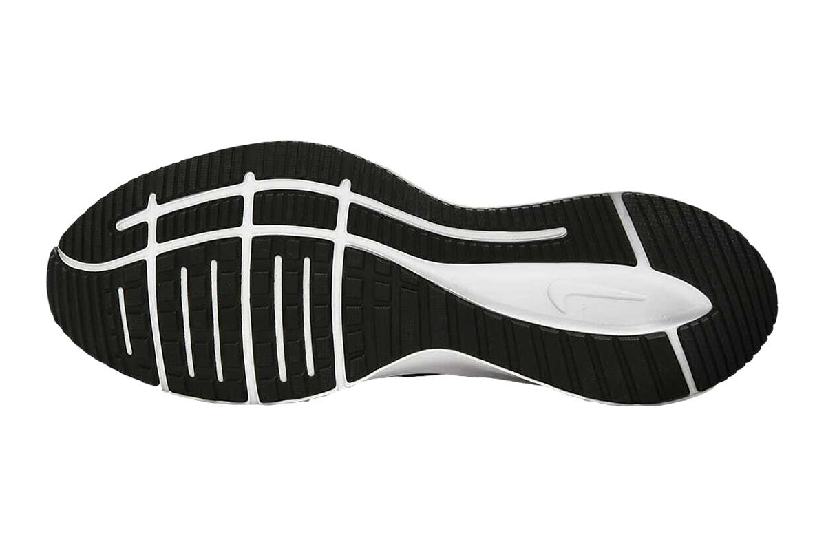 The mesh-lined tongue is connected to the upper’s inner lining for a secure feel. A numeric logo at the tongue spells out Nike Quest.