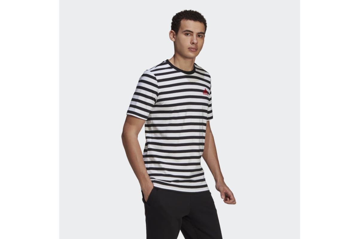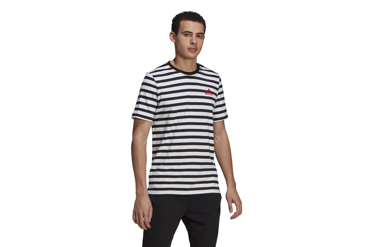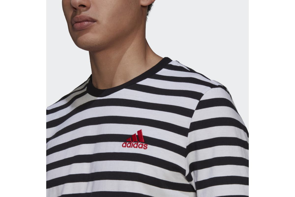 Boost your everyday wardrobe with the Adidas Men’s Stripy Jersey T-Shirt with a contrasting crewneck. This soft cotton tee pairs perfectly with denim or joggers. Tuck it in or wear it loose to fit the occasion.