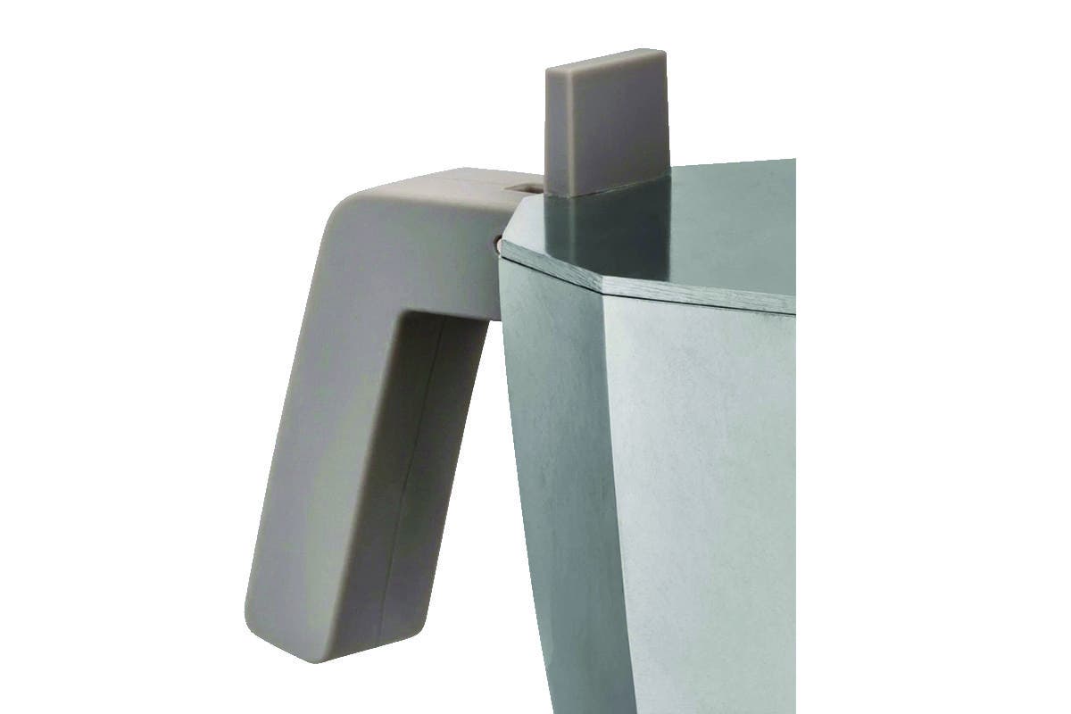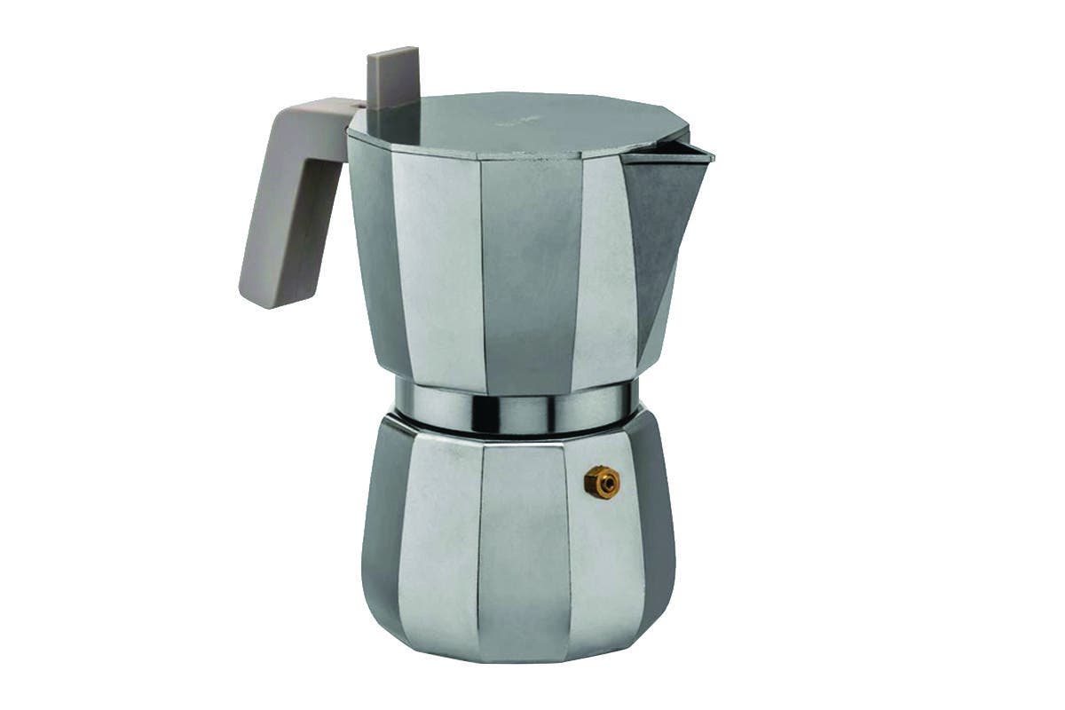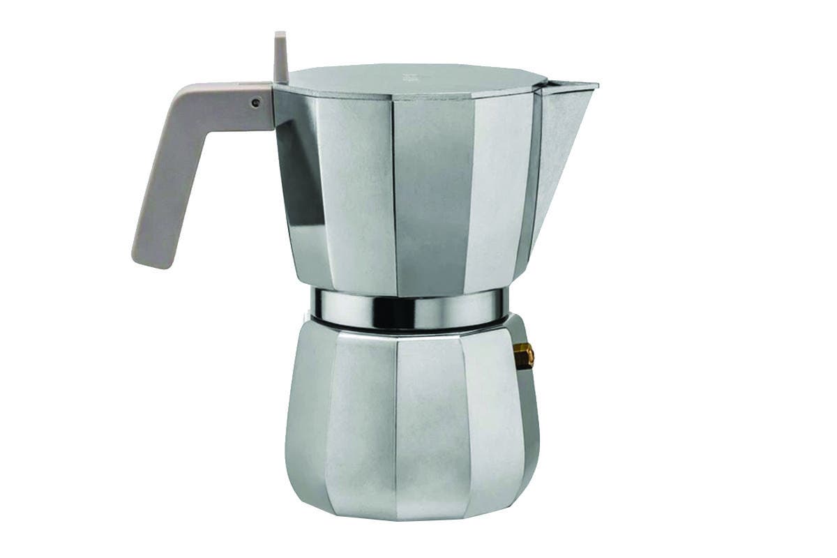 The Alessi Moka Espresso 6 Cup Coffee Maker with a magnetic base, suitable for multiple heat sources. Fitted with a double funnel filter, Moka can be used to prepare espresso coffee as well as standard filter coffee.