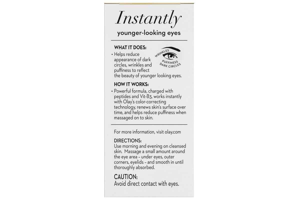 Helps reduce appearance of dark circles, wrinkles and puffiness to reflect the beauty of younger looking eyes. Fight dark circles, wrinkles and puffy eyes in an instant with the Olay Ultimate Eye Cream. This 3-in-1 cream instantly reduces the appearance of fine lines and wrinkles. Supercharged with peptides and vitamins, it renews skin’s surface over time and reduces puffiness by massaging onto skin. Formulated with Olay’s colour-correcting technology, it acts as a touch of concealer that matches all skin tones. The powerful formula hydrates to smooth and brighten the eye area. Give your eyes a boost of beauty and moisture with Ultimate Eye Cream for wrinkles, puffy eyes and dark circles.