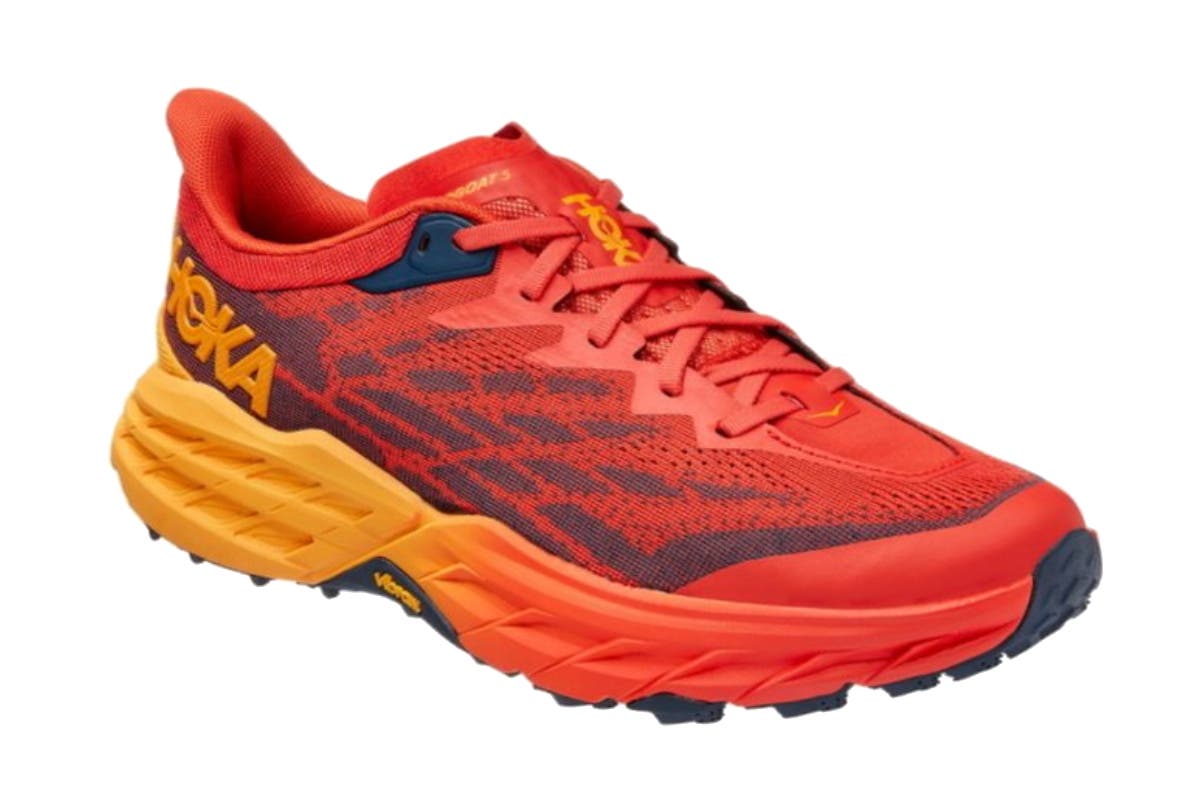 New shoes from outsole to laces, Hoka One One Men’s Speedgoat 5 Running Shoes are updated with Vibram megagrip with traction lug for enhanced grip on loose soil. Retaining the same stack height and rocker profile, Speedgoat 5 Running Shoes employ a lighter midsole compound and heartier, double layer jacquard mesh to inspire confidence on any terrain.