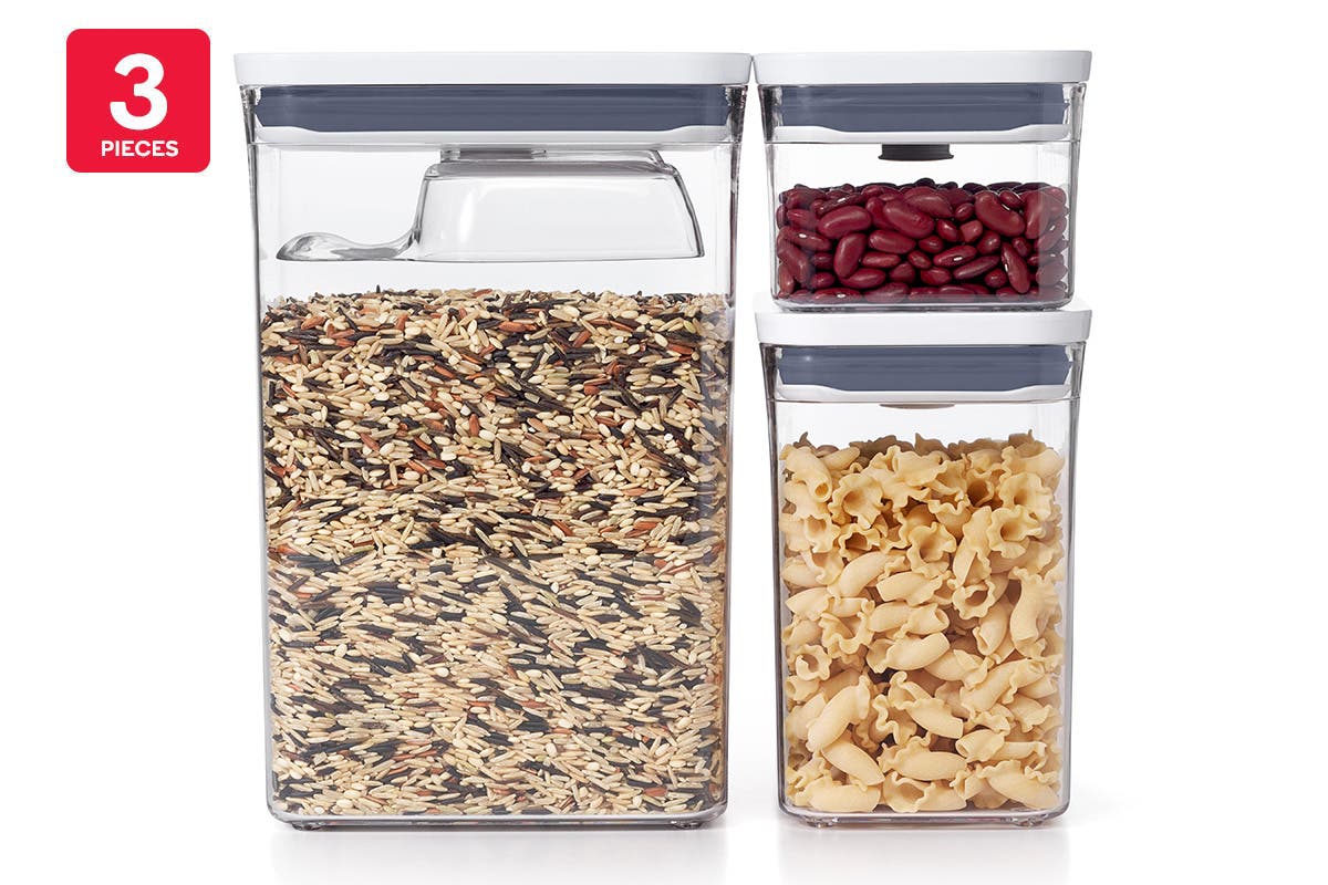 Keep dry foods, ingredients and food items fresher for a longer duration while saving heaps of storage space by keeping it easily organised with the OXO POP 3-Piece Rectangle Set with Scoop.