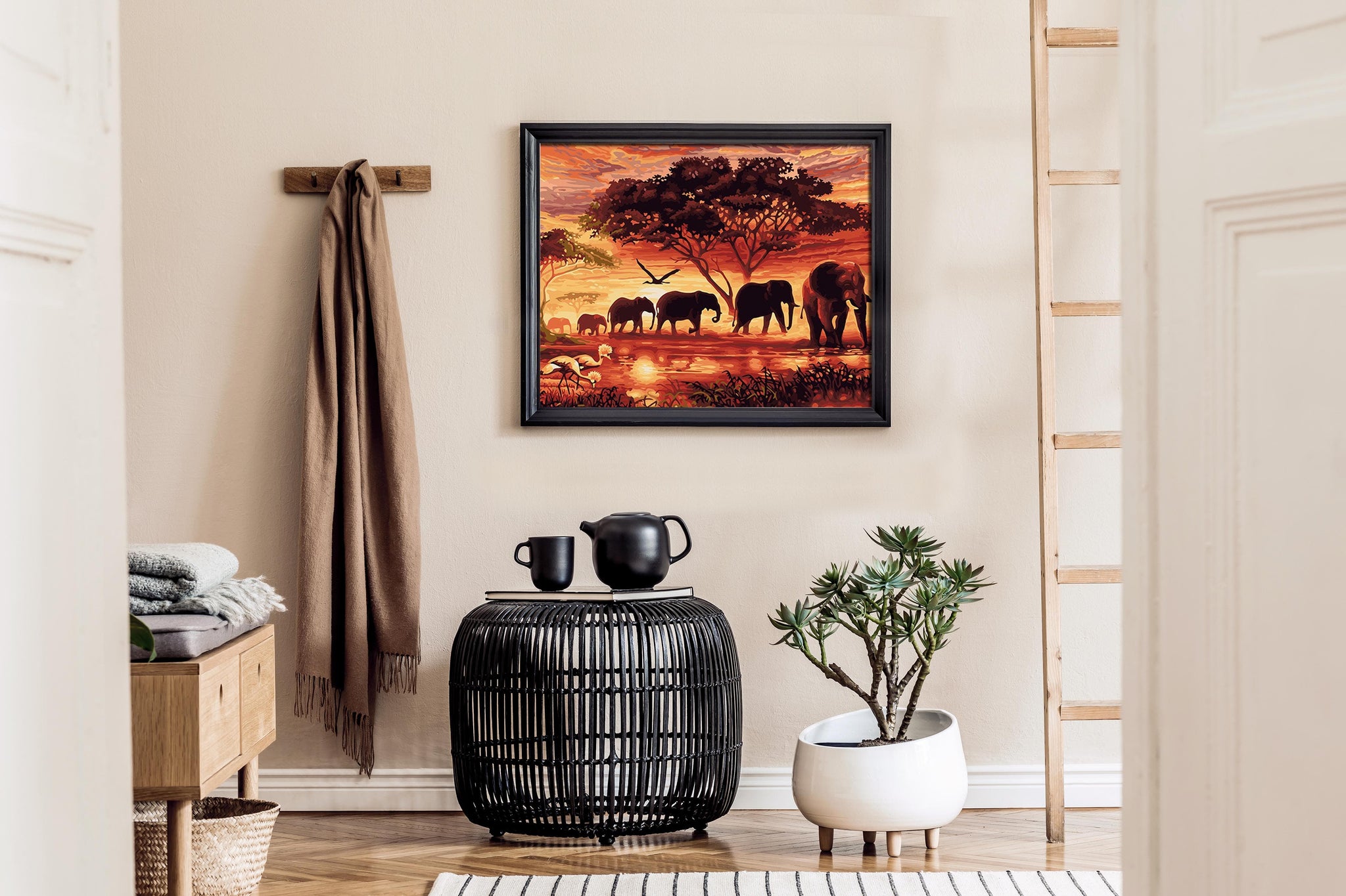 Enter a meditative state of mind as you colour by numbers a beautiful abstract scene of a herd of peaceful elephants on the savannah at sunset.