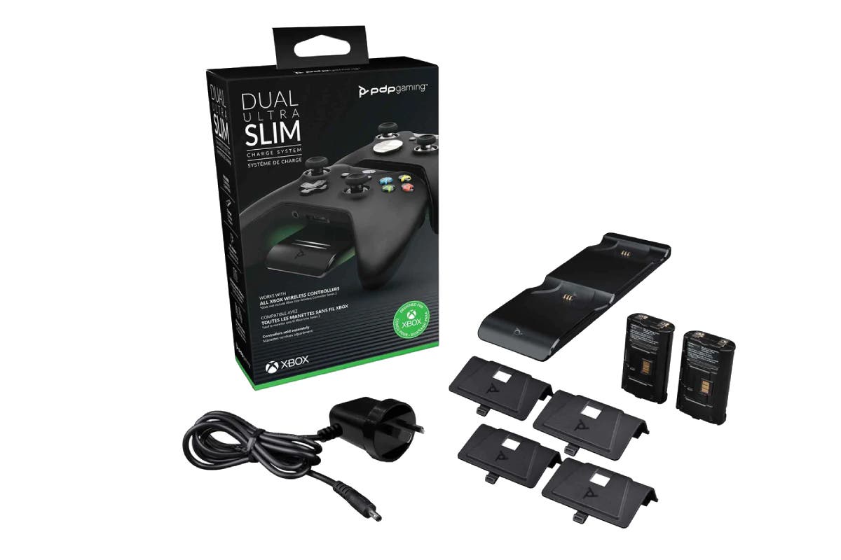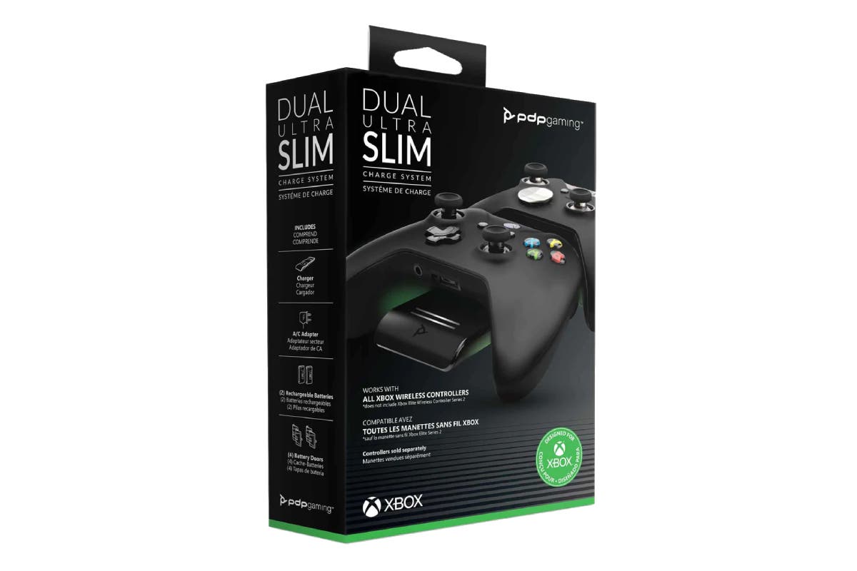 The PDP Dual Ultra Slim Charge System for Xbox Series X Controller works with Xbox Series X, Xbox Series S and Xbox One. It comes with two rechargeable batteries and four battery doors. Magnetic ports snap the controller into place for an optimal connection every time. With advanced, micro-suction material, the charge system will stay in place and only move when you want it to. The slim, modern design fits seamlessly into your living or gaming room. Cinematic, auto-dimming lights adapt to surrounding conditions to be less intrusive in the dark. LED indicators on the front show you the charge status of the controllers by moving while charging and remaining static when fully charged.