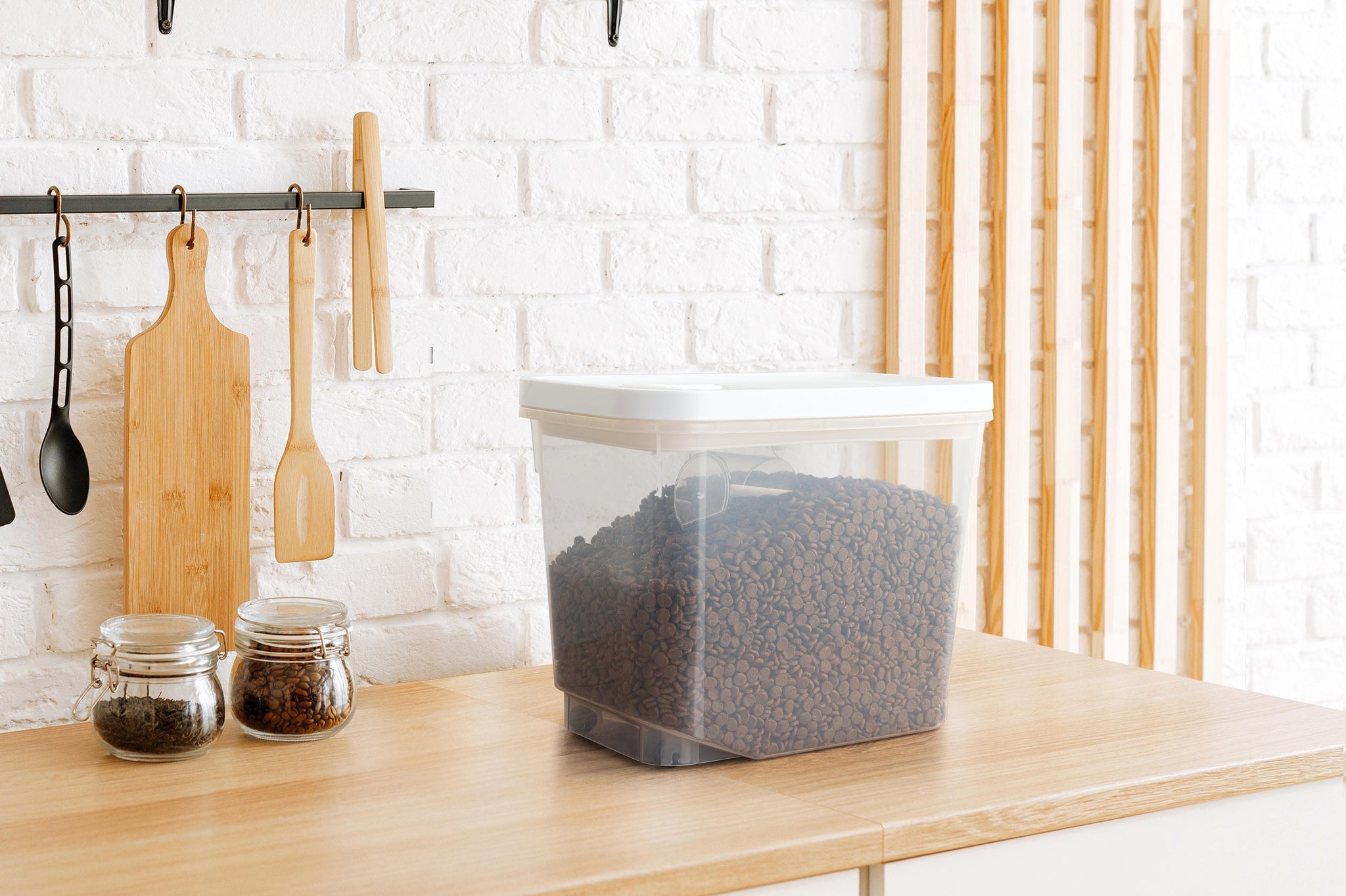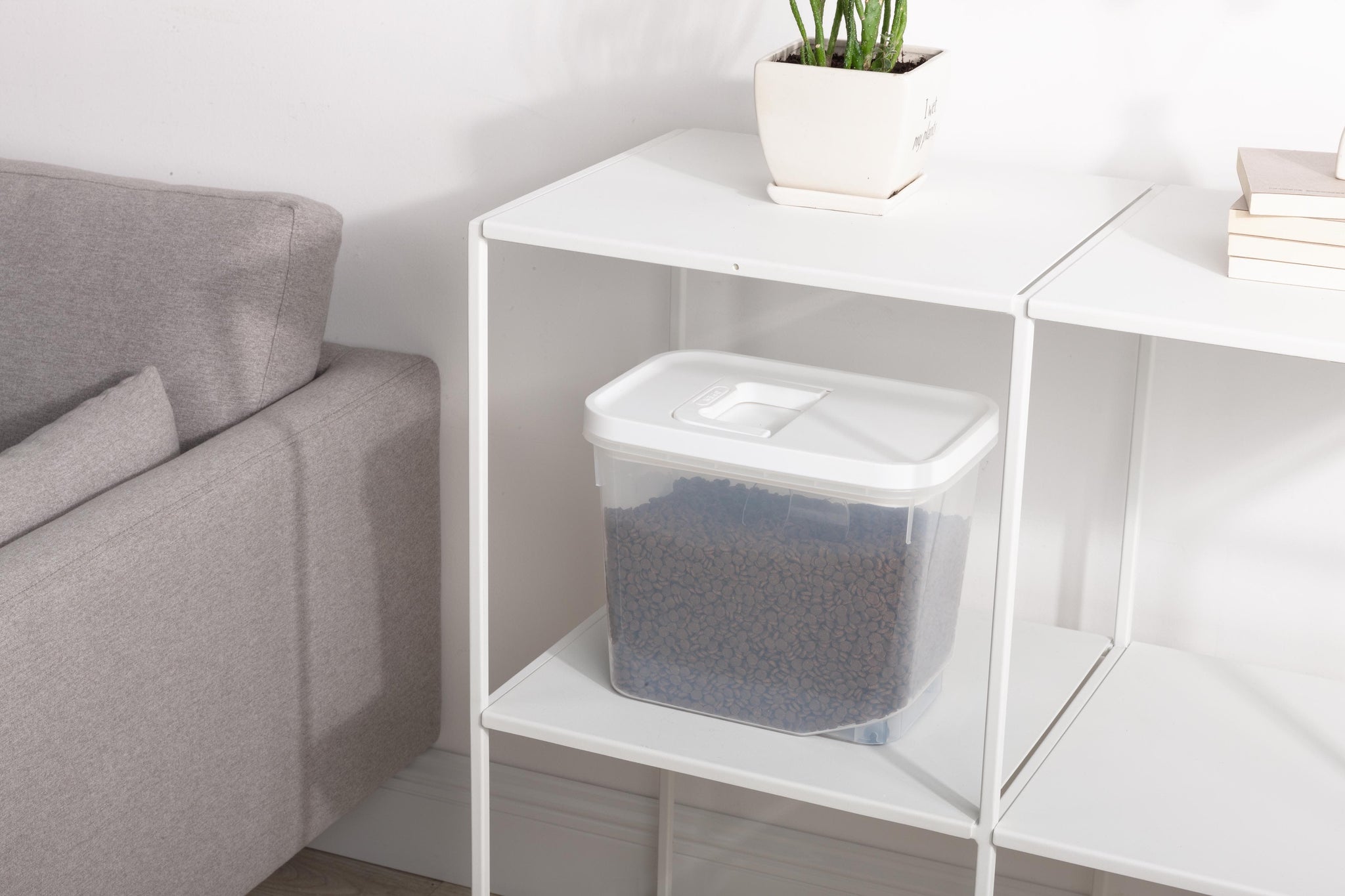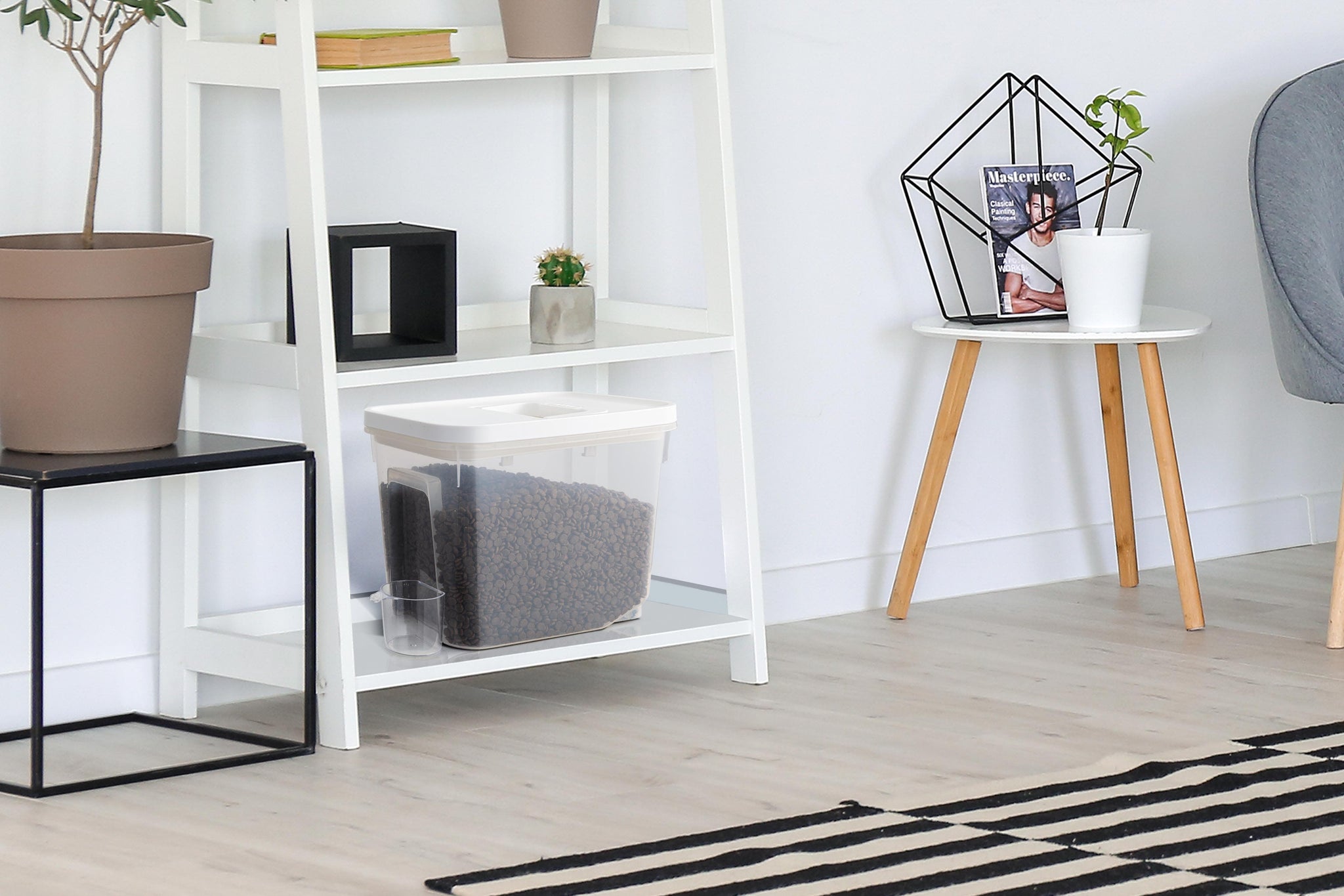 The large capacity can easily store big bags worth of dry dog or cat food, or bird seeds, so that you always have enough pet food ready to go for the week ahead. Use the included scoop to conveniently scoop out a perfectly measured portion every time!