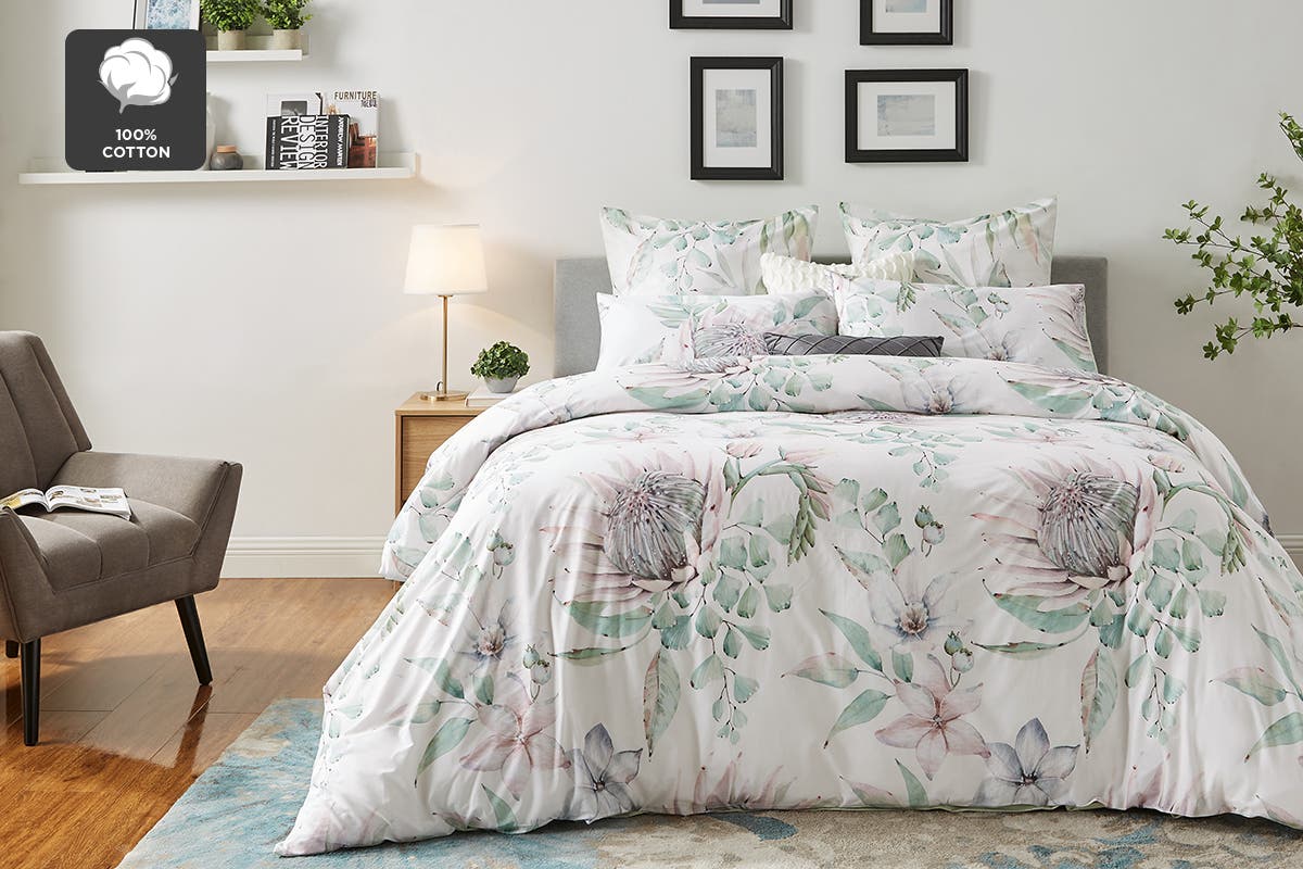 Elevate your bed linen collection with this stunning 100% cotton quilt cover set that features a gorgeous pattern of printed protea flowers that is as luxuriously soft and comfortable as it is beautiful.