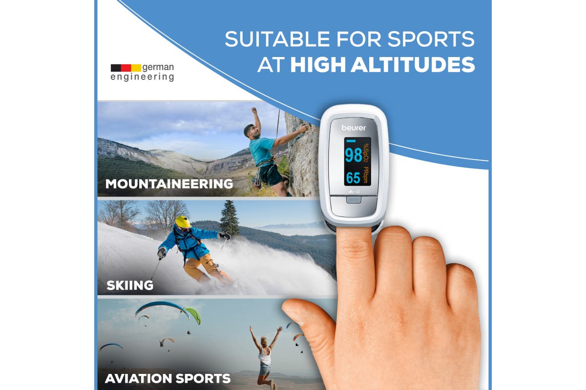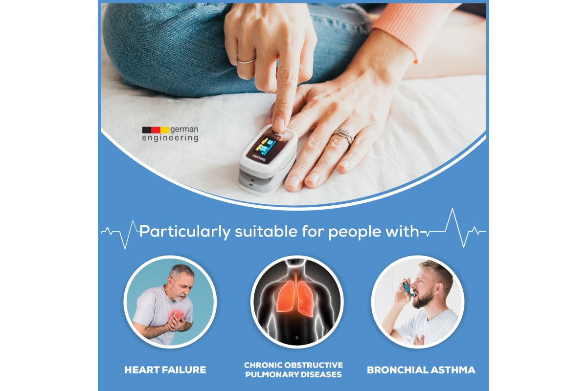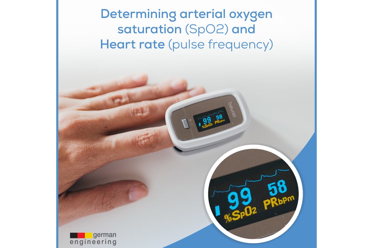 The Beurer Pulse Oximeter is particularly suitable for persons with heart failure, chronic obstructive pulmonary diseases, bronchial asthma and also for sports at high altitudes. Respiratory diseases such as asthma, COPD, COVID-19, long COVID and other lung diseases may lead to a drop in oxygen saturation.