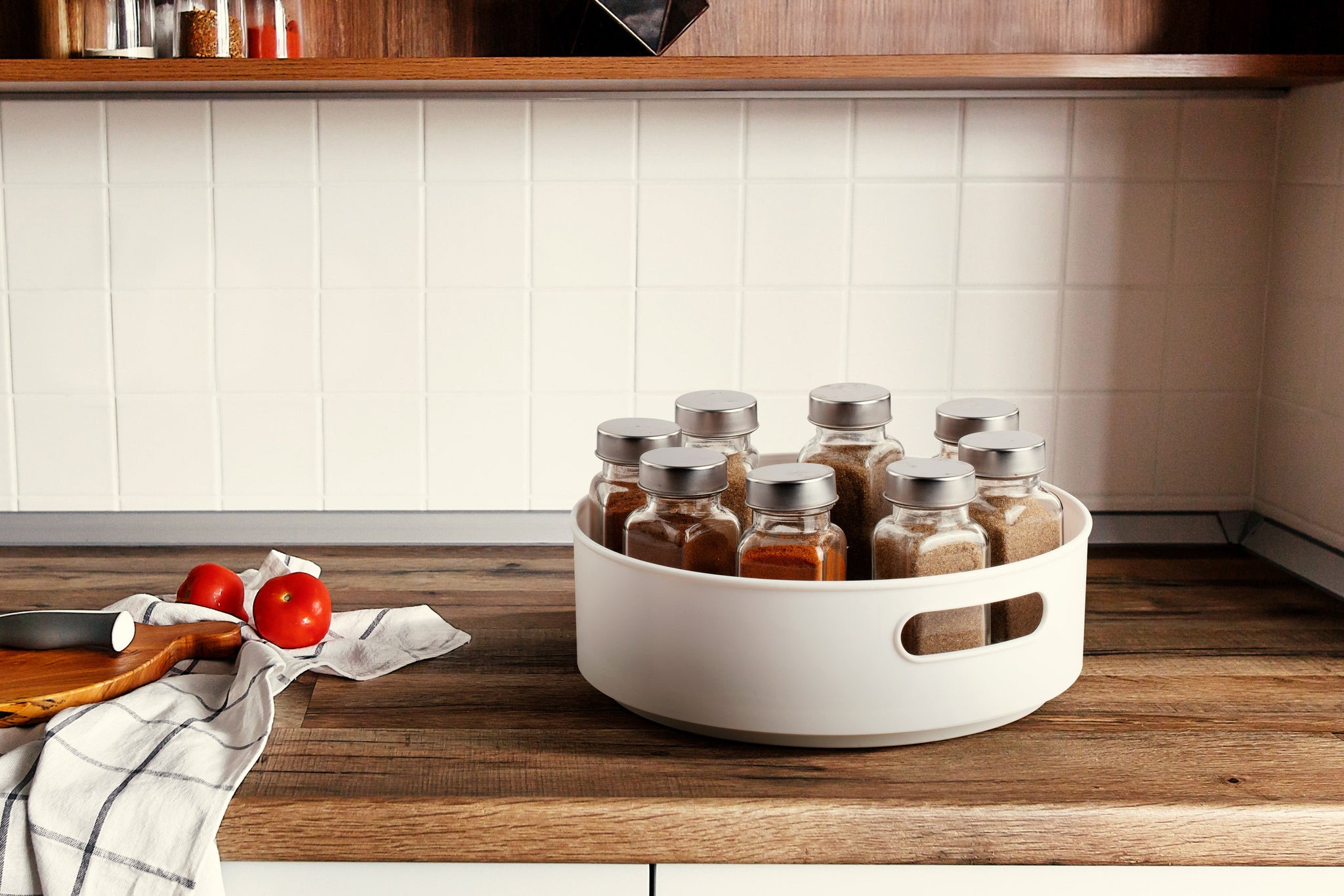 The shelf of this rotating spice rack makes it easy to pack away pantry clutter and its compact size take up little room in the pantry or on a kitchen bench.