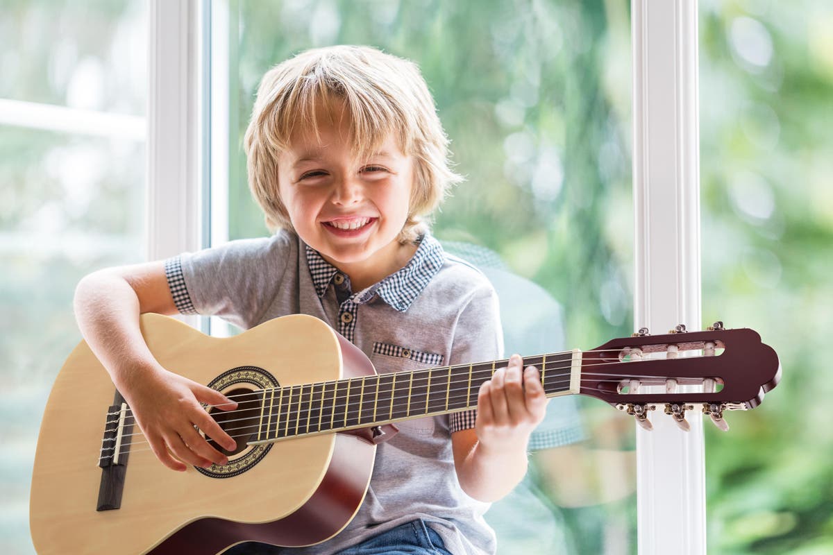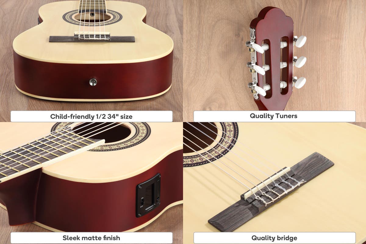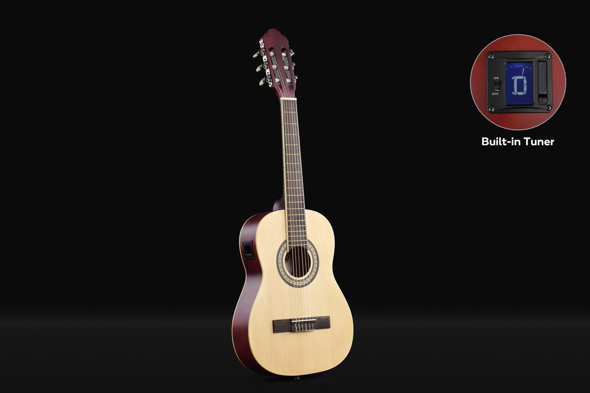 Pluck the strings, play the chords and begin an incredible musical journey with this easy-to-use half-size classical guitar with nylon strings, a cut-away neck and in-built tuner, perfect for people of any skill level.