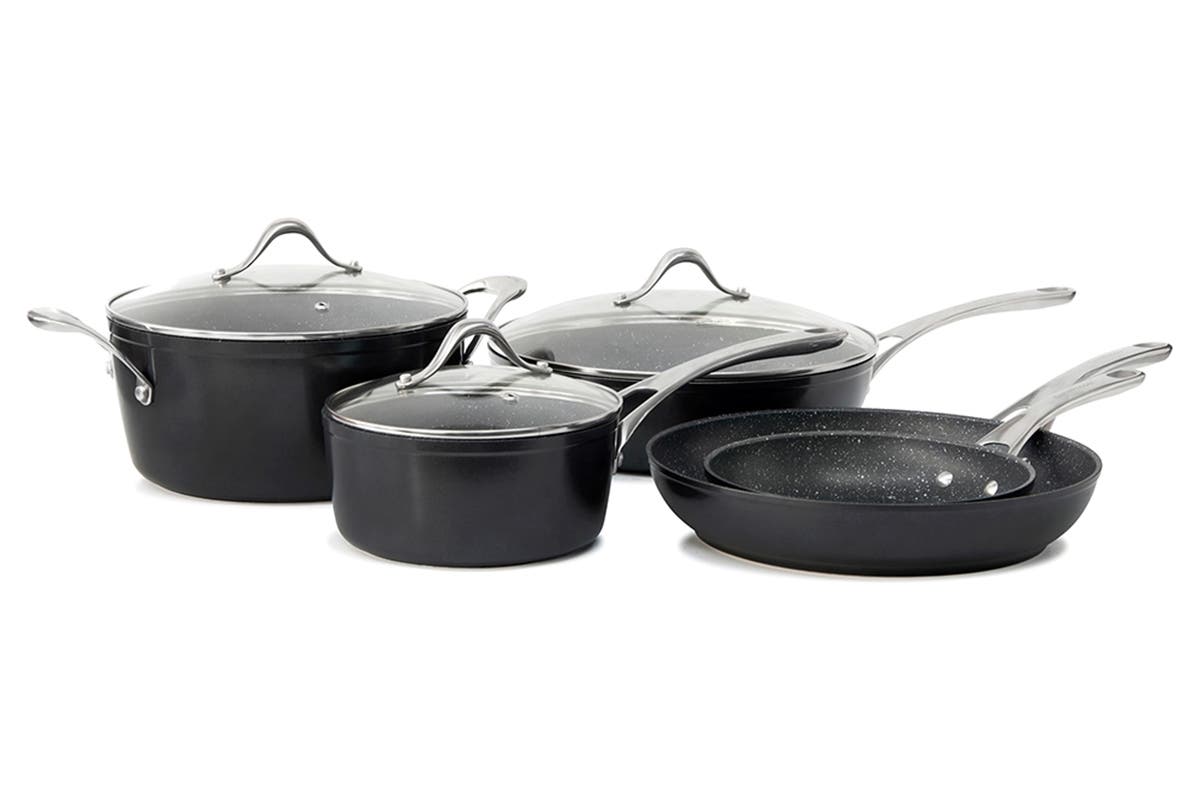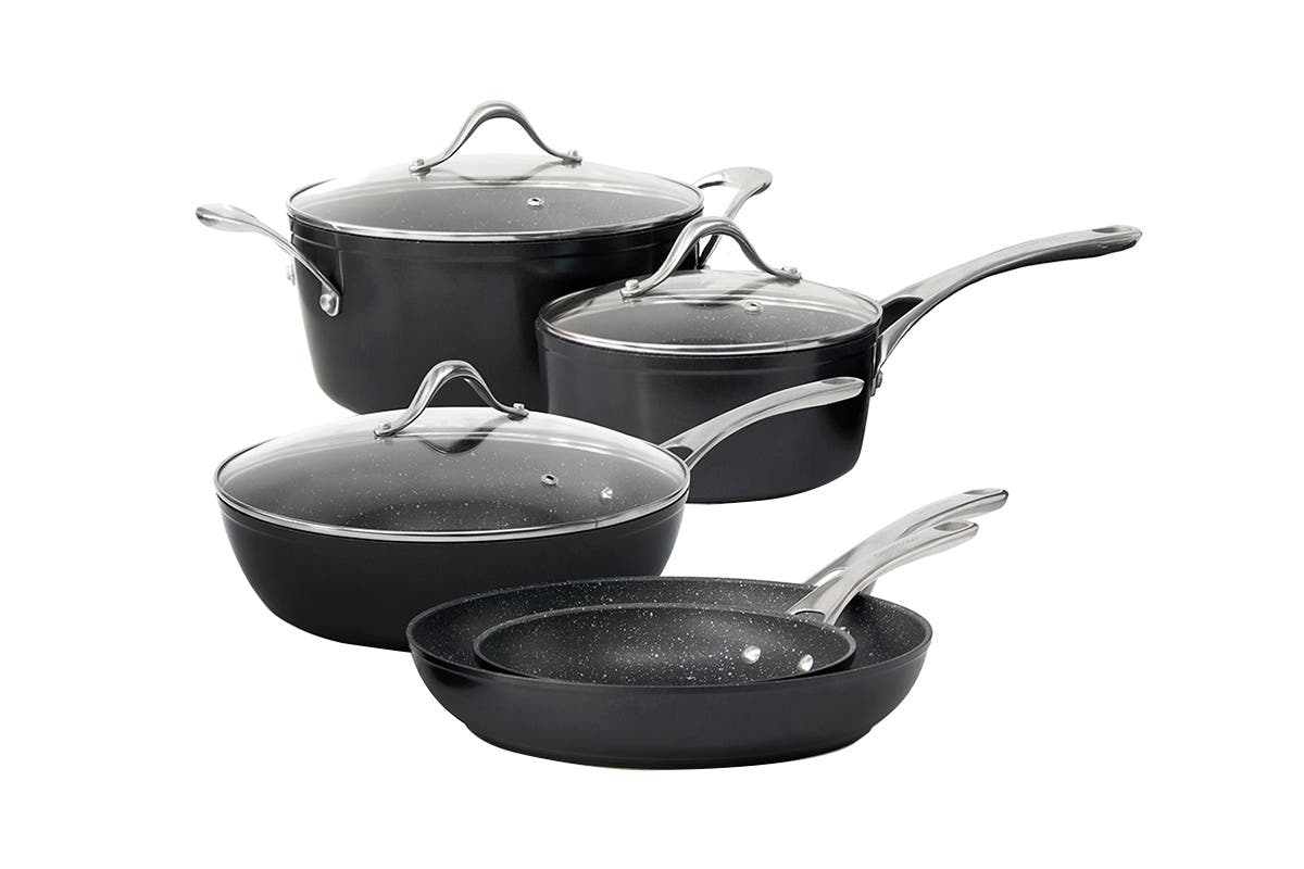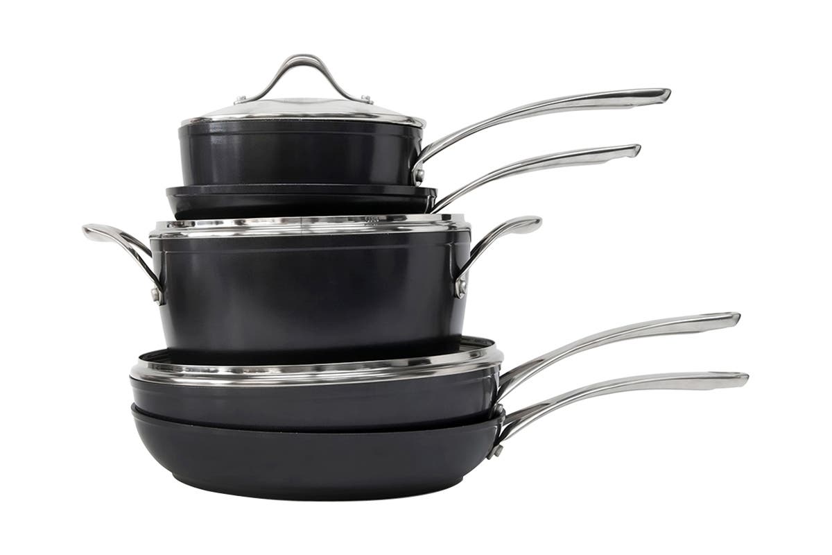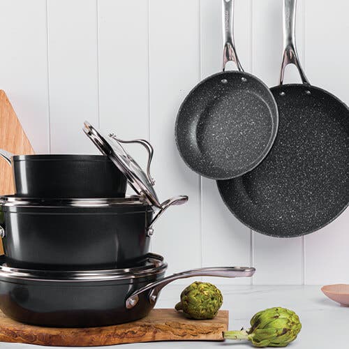 The Salt & Pepper Tan-Ium Cookware Set includes a range of pots and pans using cutting edge technology to increase durability and ease of use.