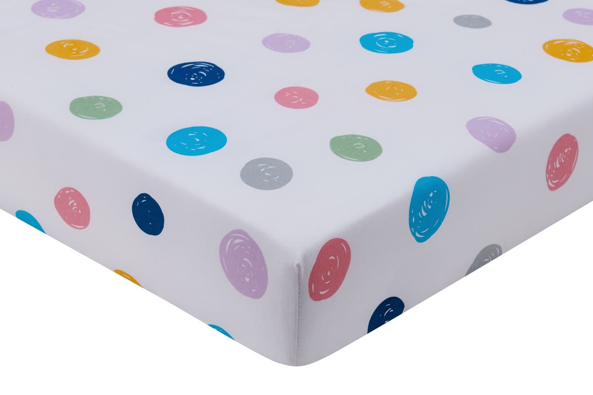 Bring a playful pop of colour to the kids’ bedroom with a pack of two fitted sheets with bright polka dots drawn in childlike squiggles.