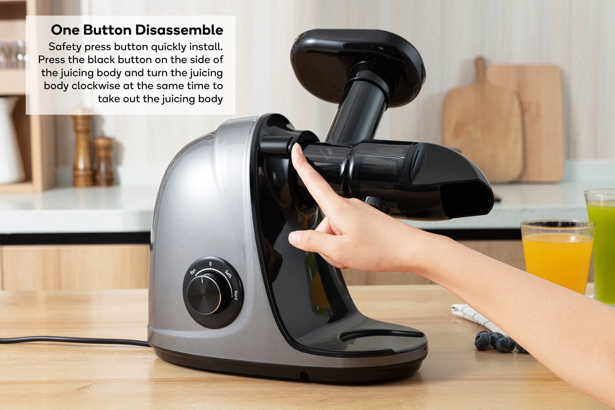Use the control dial to set the slow juicer to one of two speed settings, with “Soft” lower power mode for softer fruits and vegetables like tomatoes and oranges, and “Hard” higher power mode for harder fruits and vegetables like carrots, celery and beets.