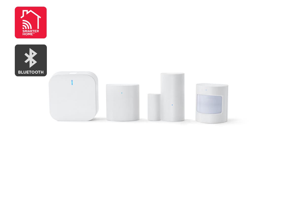 Enjoy a connected smart home of the future with a kit that includes a motion sensor, a door and window security sensor, a temperature and humidity sensor and a gateway plug to link them all, letting you control them with your phone.