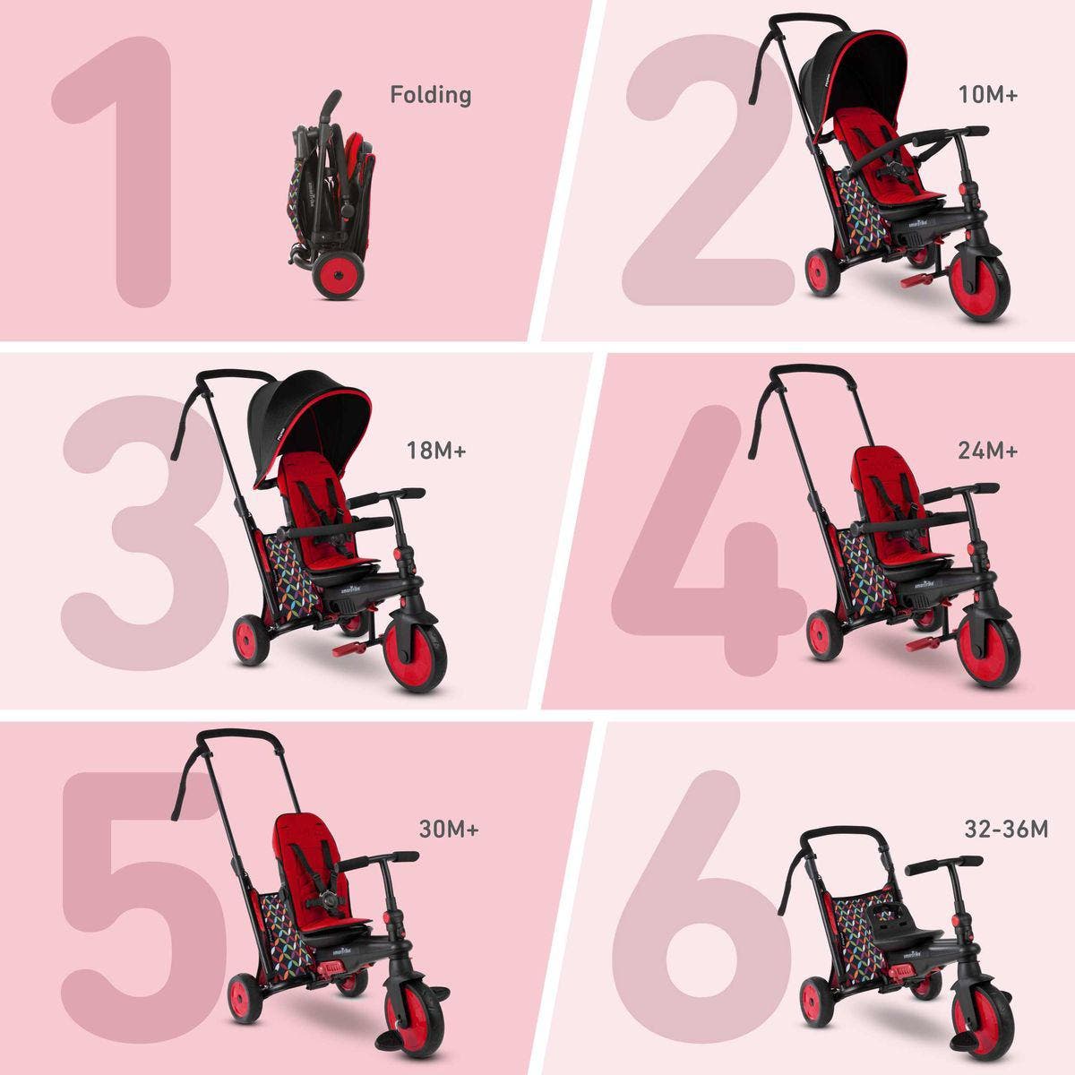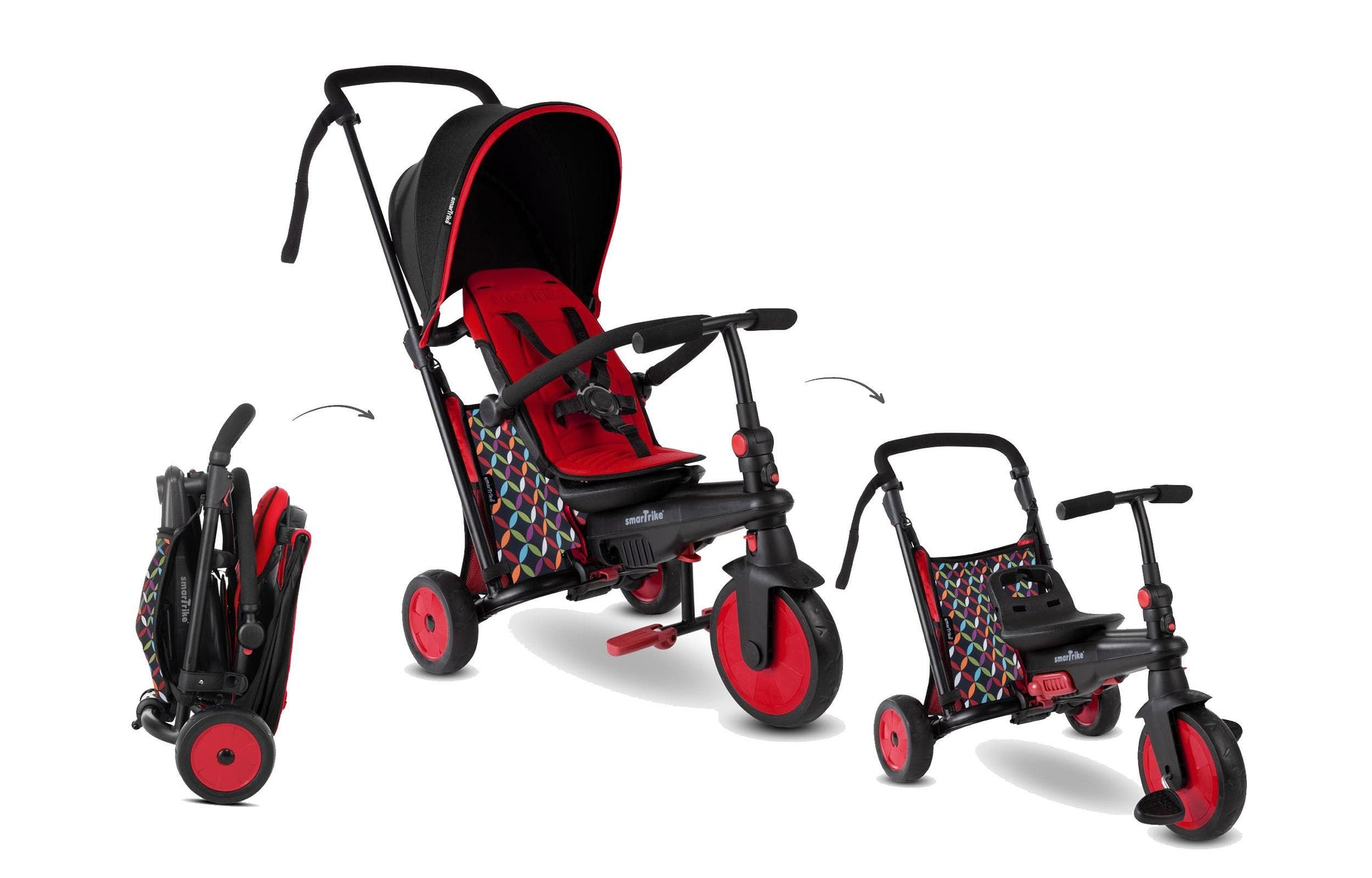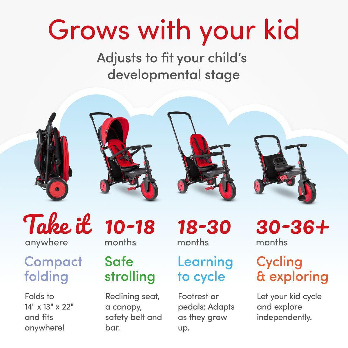 The SmarTrike STR3 Folding Stroller Trike features a reclining seat so your baby can sit upright or nap comfortably on-the-go. It has a full padded seat cover for optimal comfort that can be removed and washed when needed. This trike grows with your baby in 6 stages from a baby push tricycle to an independent toddler tricycle, helping them develop the motor skills, confidence and balance needed for independent riding.