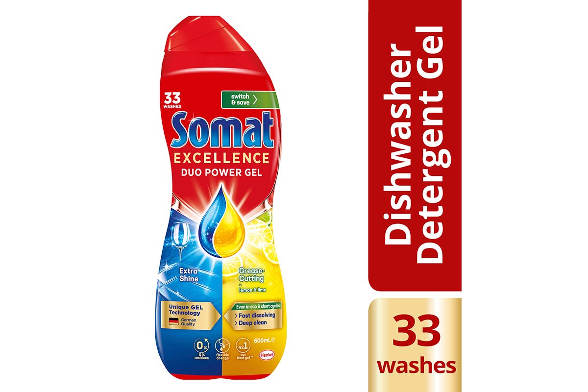 The Somat Excellence Duo Power Gel Lemon Dishwashing Gel Detergent is a multifunctional liquid dishwasher detergent that combines 2 complementing formulas to act against stubborn stains and dirt.