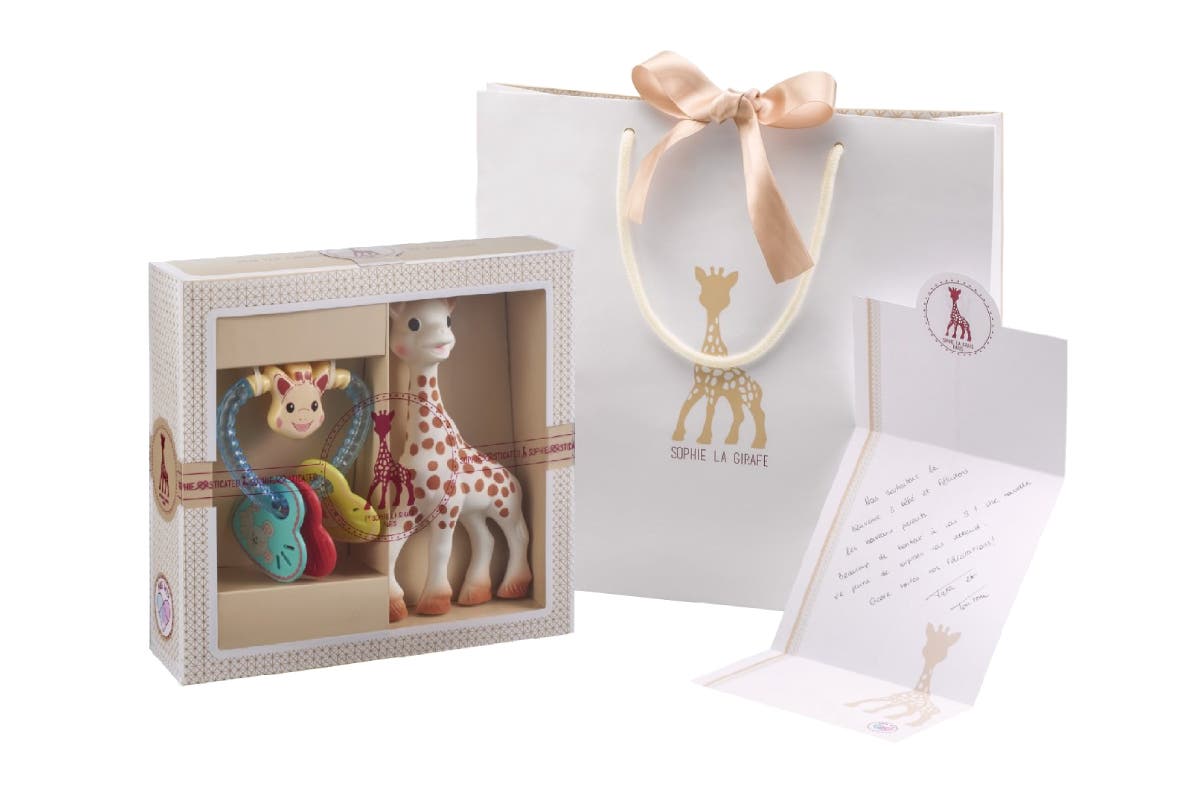 The Sophie La Giraffe Sophisticated I Love Sophie Set features, an Original Sophie la girafe and a Sophie la girafe Heart Rattle.