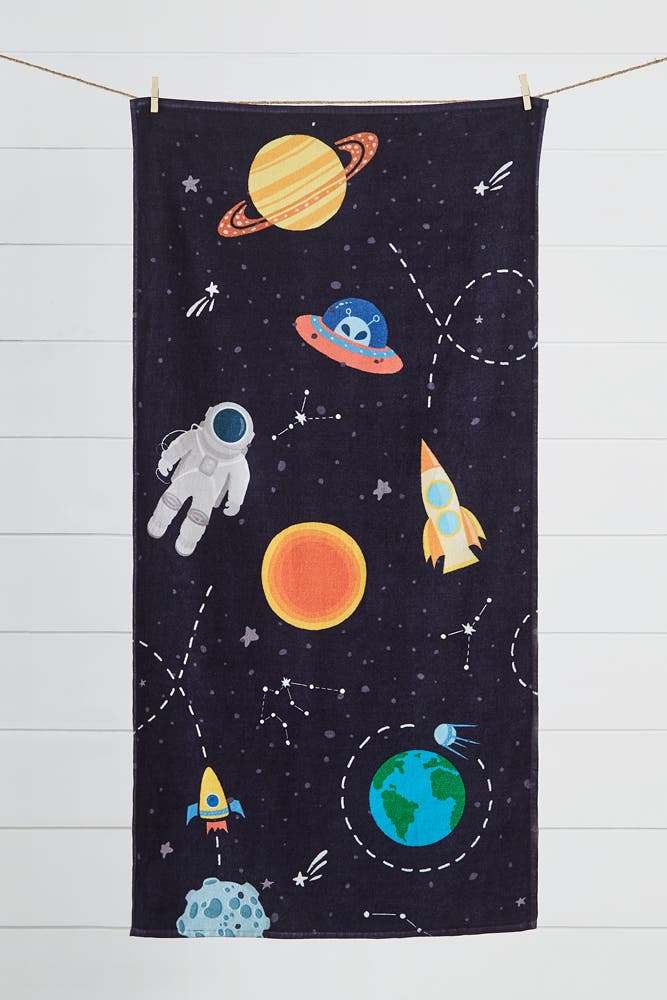 Bring a splash of bright design to your summertime with this space adventure beach towel that adds extra excitement to beach trips and helps your kid dry off after swimming.
