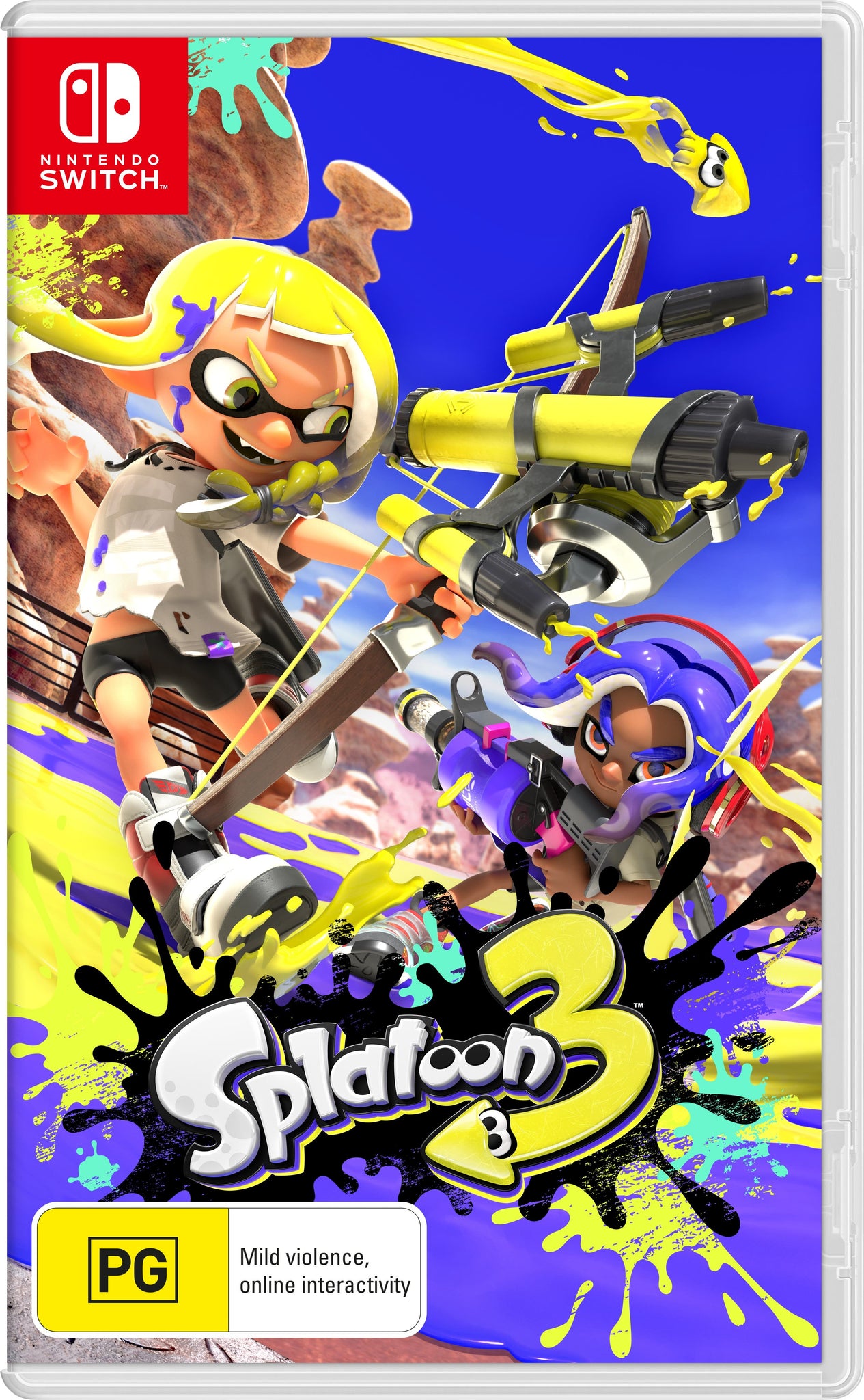 Ink up the Splatlands in the Splatoon 3 (Nintendo Switch) game. Enter the Splatlands, a sun-scorched desert inhabited by battle-hardened Inklings and Octolings. Splatsville, the city of chaos, is the adrenaline-fuelled heart of this dusty wasteland.