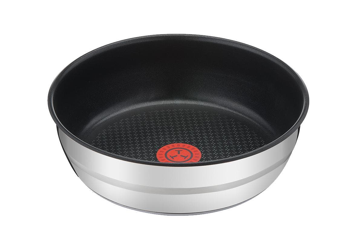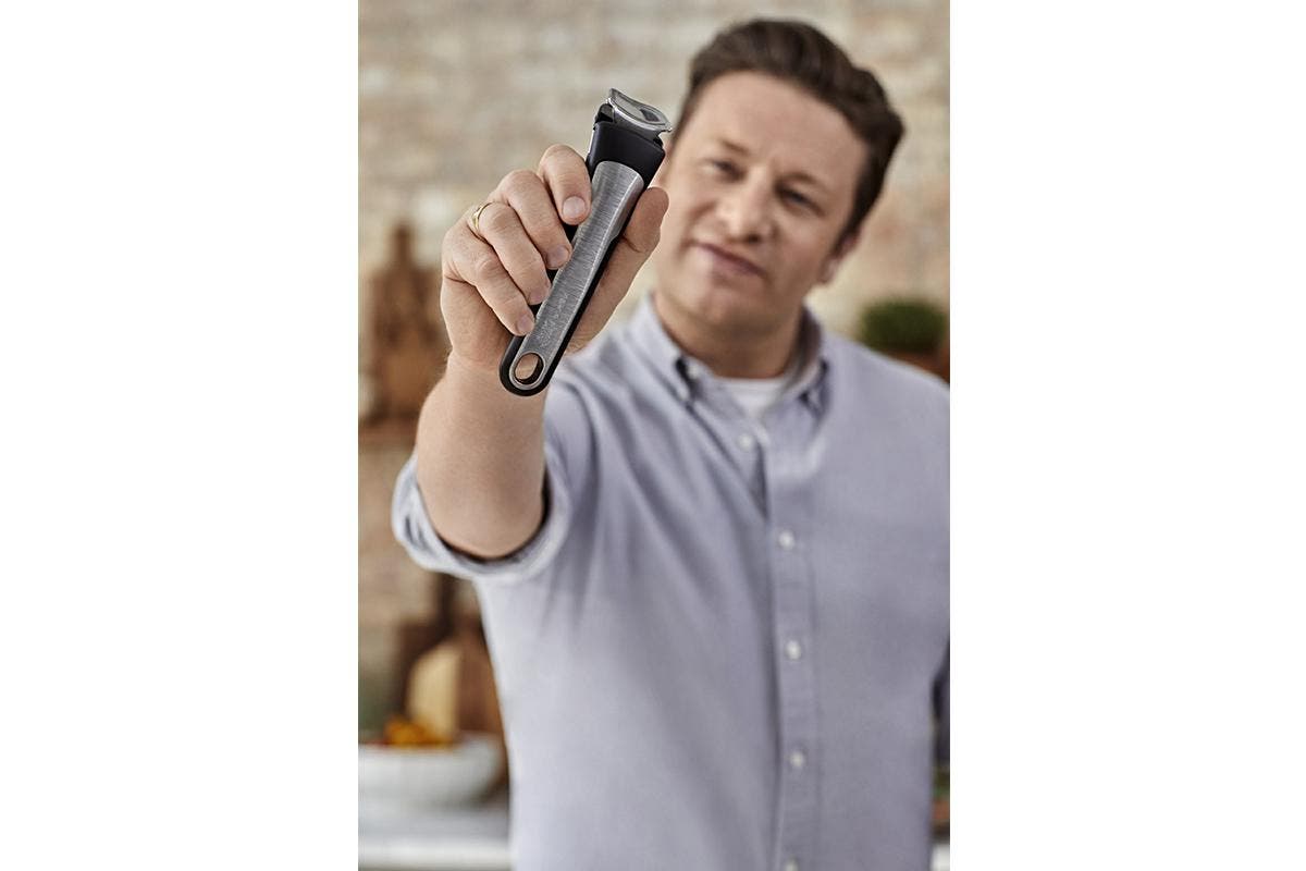 Ingenio Jamie Oliver handle for versatility and space-saving, stainless steel for durability and resistance, titanium non-stick coating and thermo-spot for easy cooking.