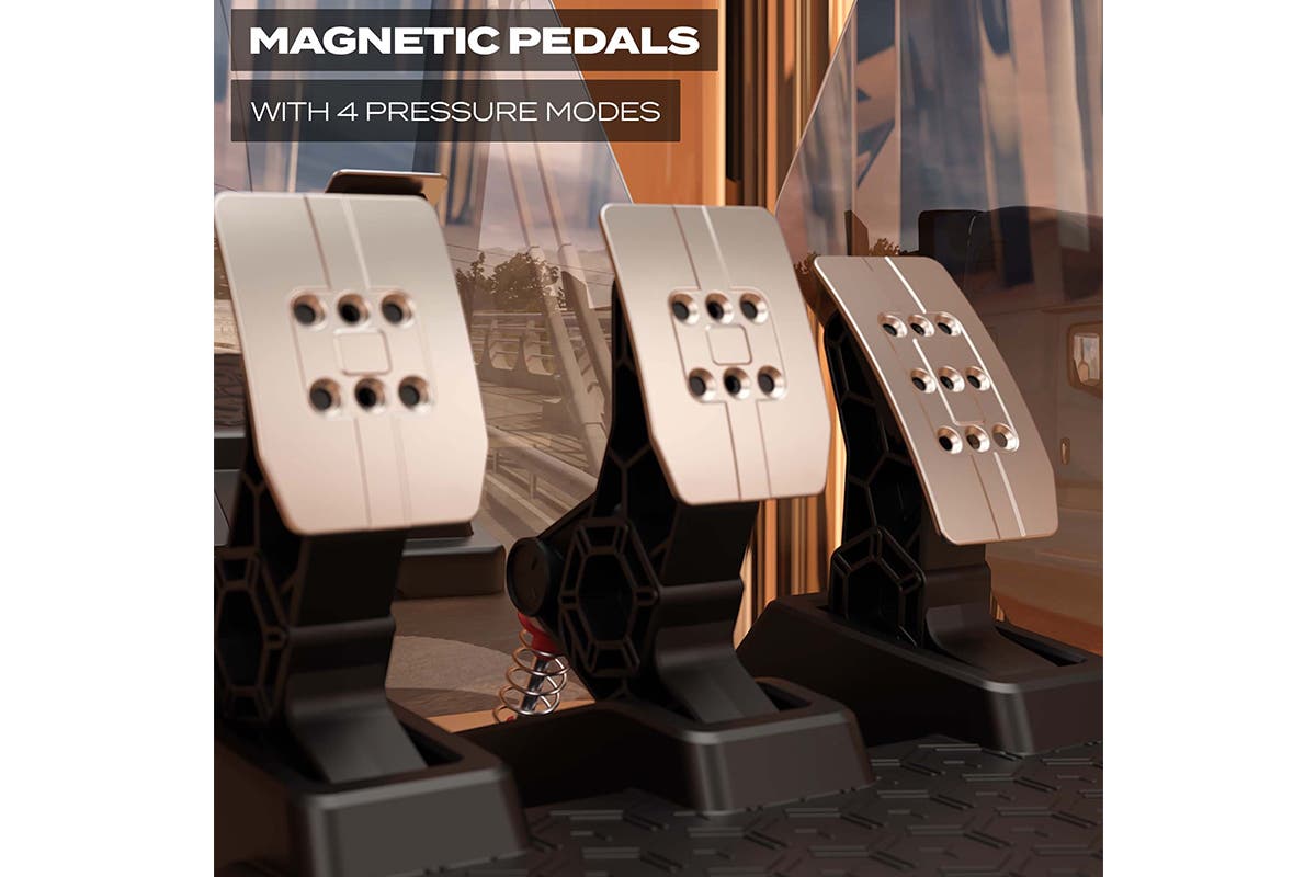 Featuring H.E.A.R.T magnetic sensors without any potentiometers or friction – for precision that won’t decrease over time and an unlimited lifespan. Adjustable pressure force with the included set of brake springs – 4 different configurations available, for use with a desk/table, cockpit or Wheel Stand Pro unit*.