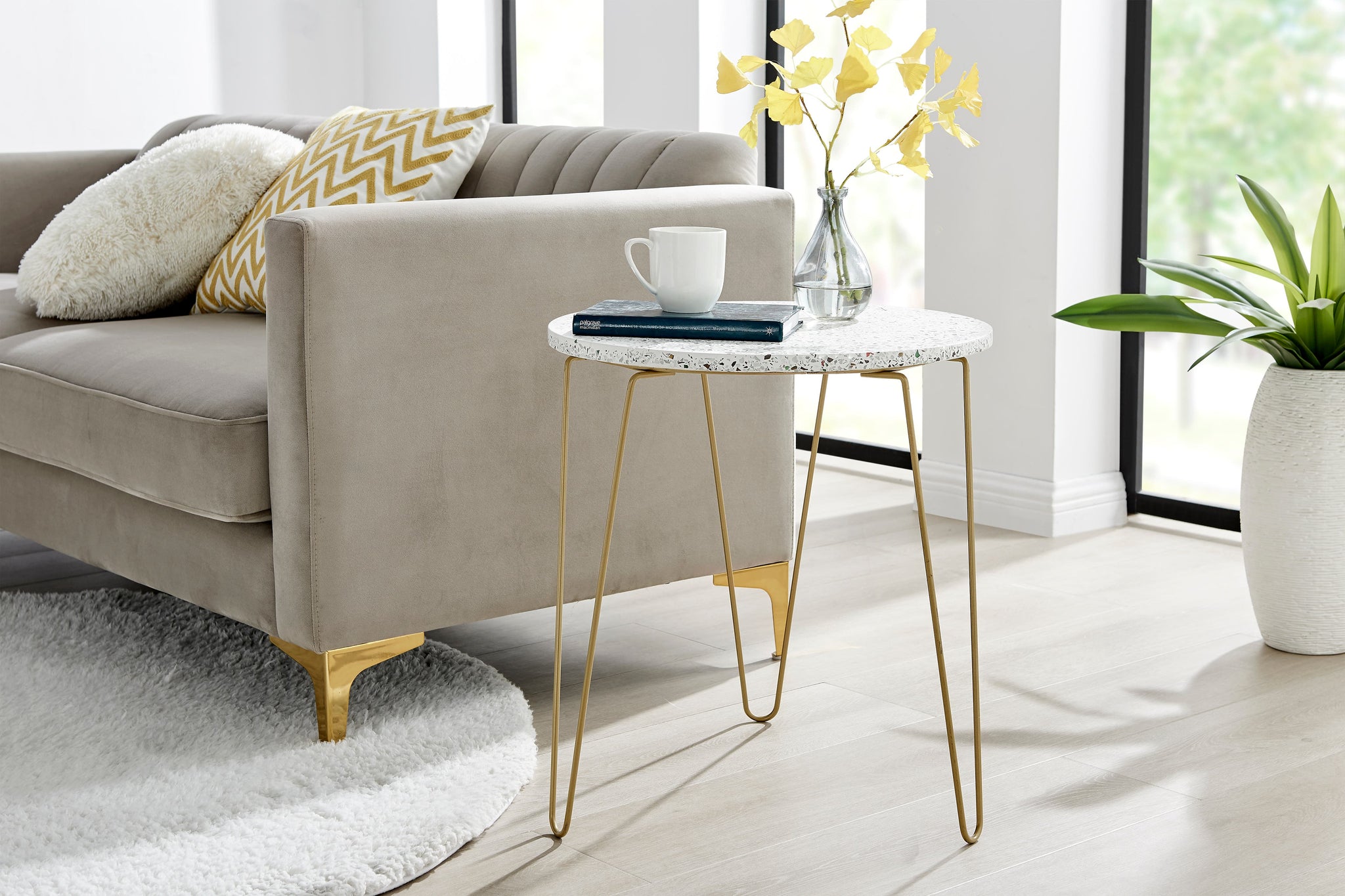 With a gorgeous terrazzo top and versatile circular design that fits snugly into the corner of the lounge or alongside your favourite couch, this terrazzo side table is a stunning place to rest your cup of tea or coffee.