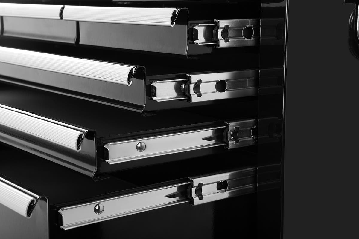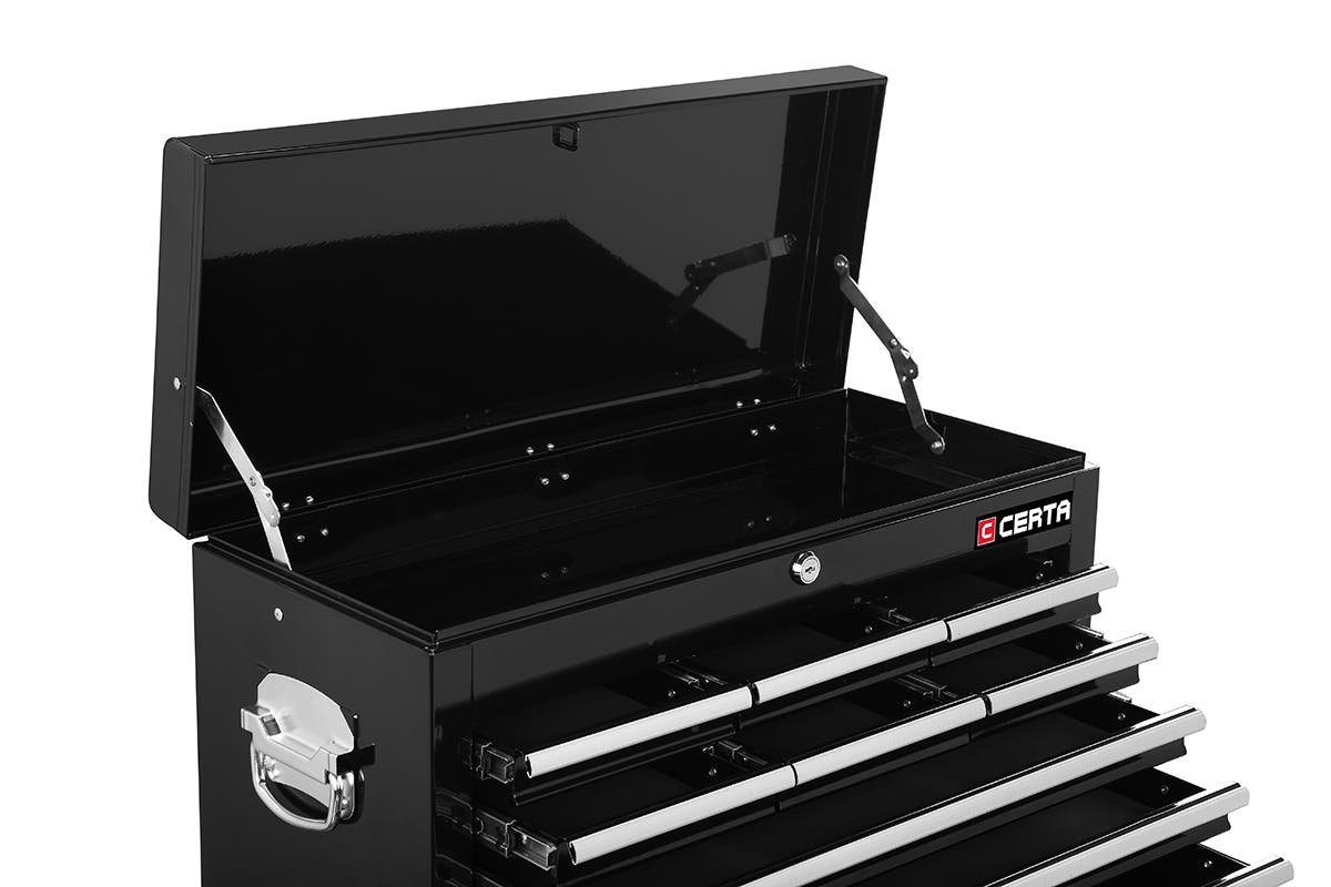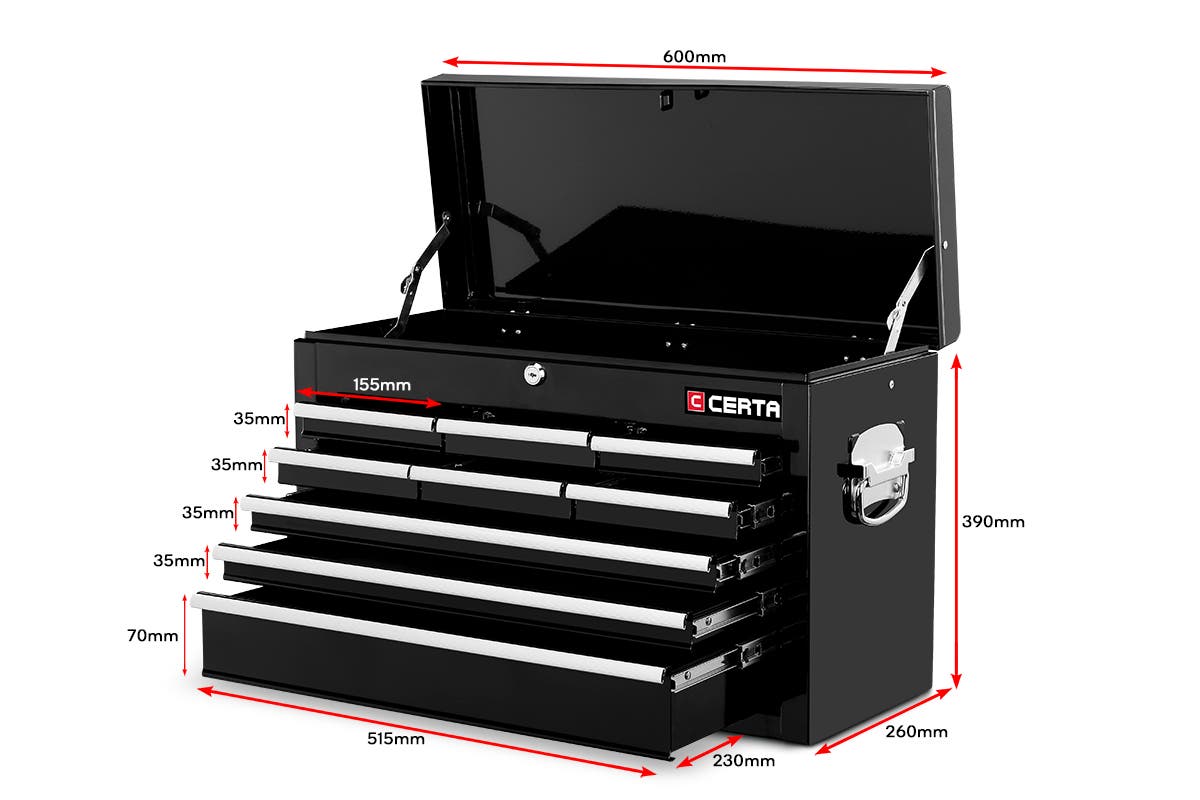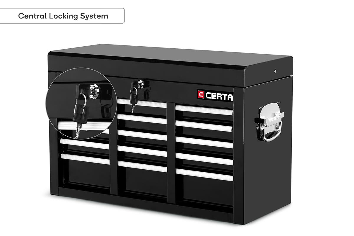 Secure your tools in the industrial cold rolled steel drawers of the Certa Toolbox Storage Cabinet 9 Drawer, featuring aluminium drawer handles, nickel plated side handles and a central locking system to stop would-be thieves.