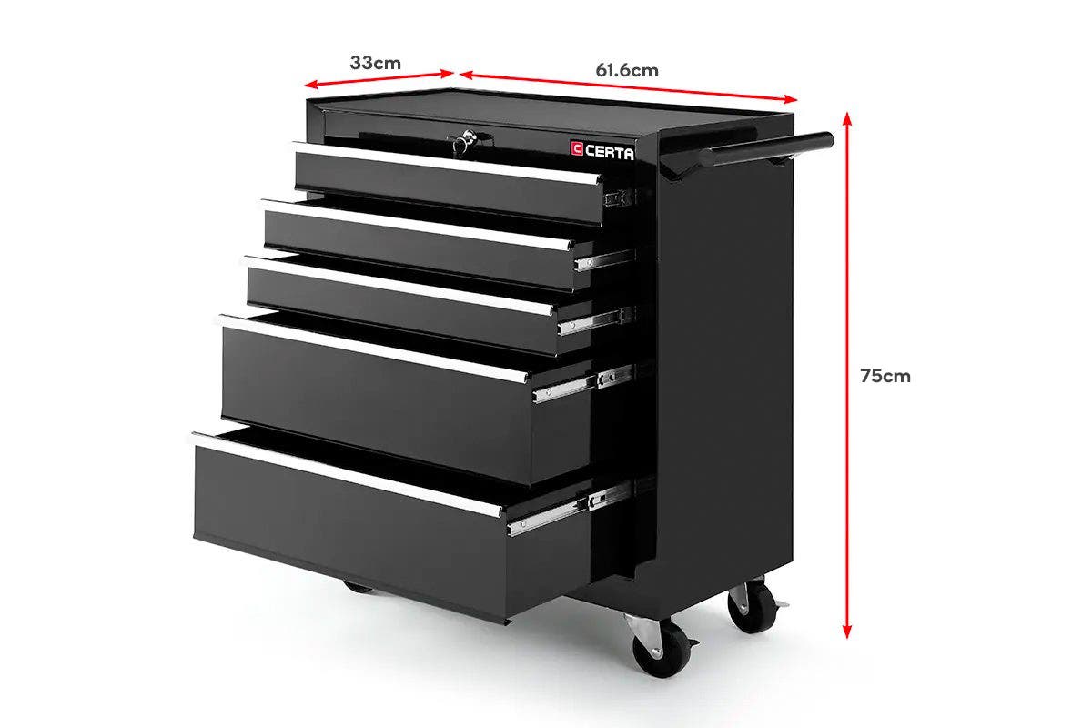 The Certa Tool Box Storage Cabinet Trolley 5 Drawer (Black) is a must-have for any mechanic, workshop or garage as it offers spacious storage for tools and a portable design that lets you wheel it anywhere.