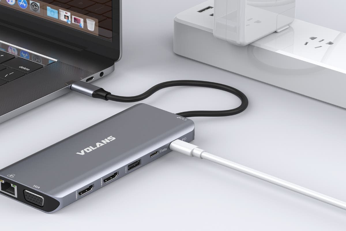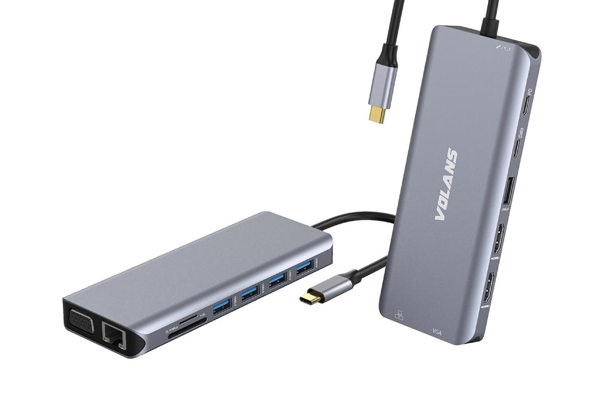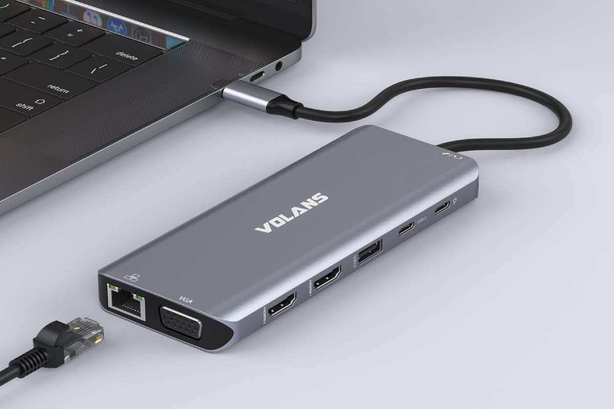 The Volans 14-in-1 Triple Display Multifunctional USB-C Hub features a full array of ports ranging from HDMI, VGA, RJ45 Gigabit Ethernet, USB-C PD charging, USB-C data transfer, USB3.0, USB2.0, 3.5mm Audio/Mic, TF and SD card reader.