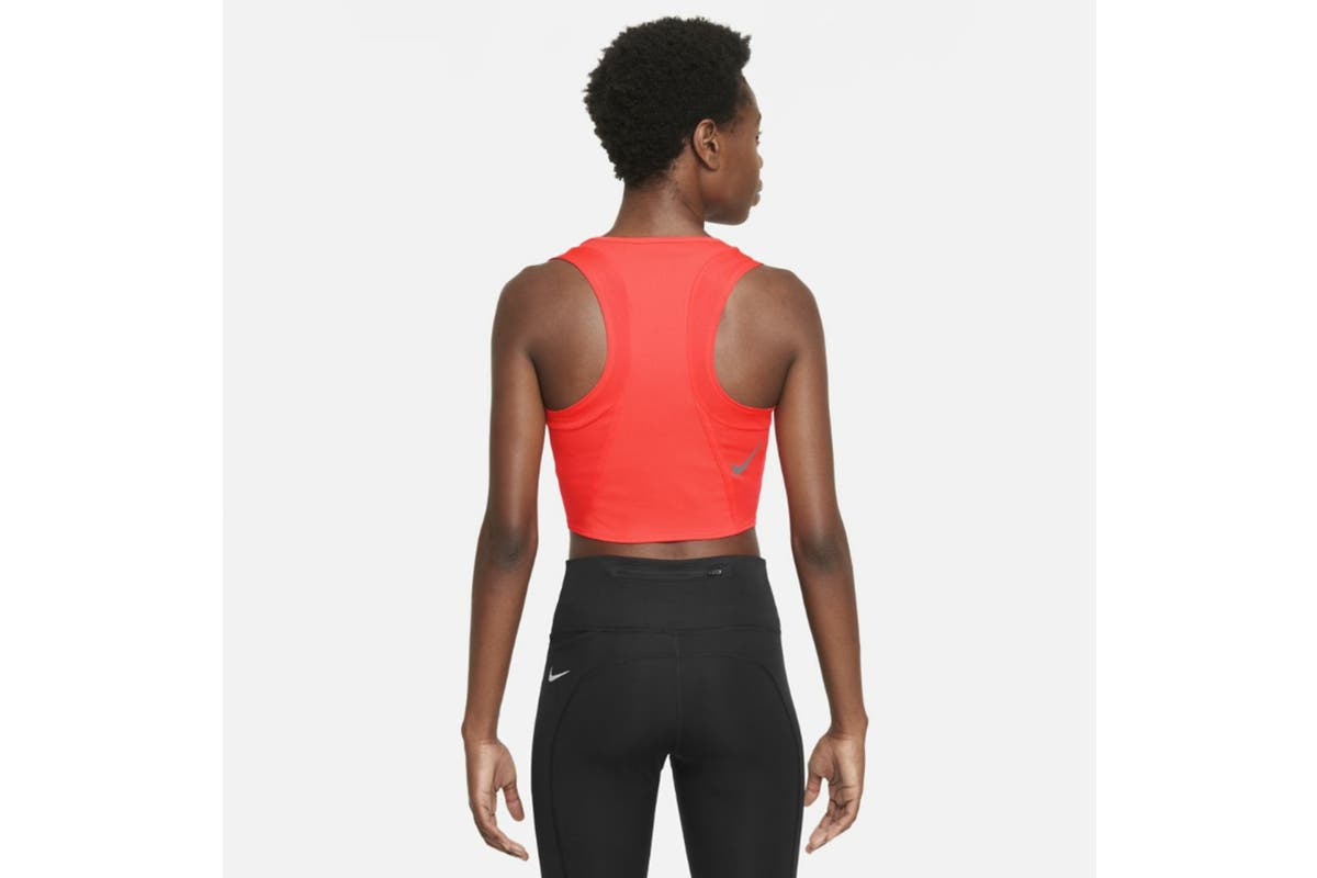 The Nike Women’s Dri-FIT Race Crop Tank is designed for performance so you can reach your personal best. Lightweight silhouettes are geared for breathability, keeping you quick and cool as you approach the finish. Swoosh graphics – on the front-left shoulder and the back-right – have a reflective design.