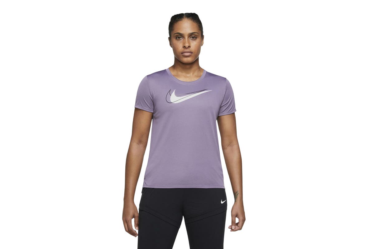 Featuring lightweight and breathable knit fabric, Dri-FIT sweat wicking technology and side vents, the Nike Women’s Dri-FIT Swoosh Run Short Sleeve Top keeps you in comfort all-day long.