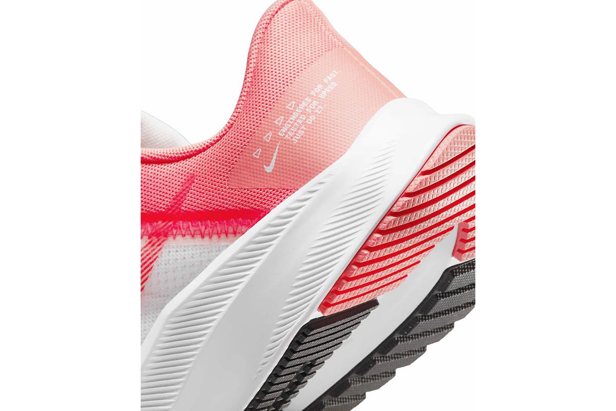 The mesh-lined tongue is connected to the upper’s inner lining for a secure feel. An alphanumeric logo on the tongue spells out Nike Quest.
