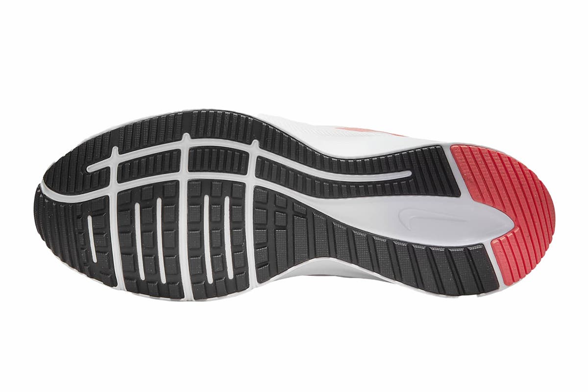 The mesh-lined tongue is connected to the upper’s inner lining for a secure feel. An alphanumeric logo on the tongue spells out Nike Quest.