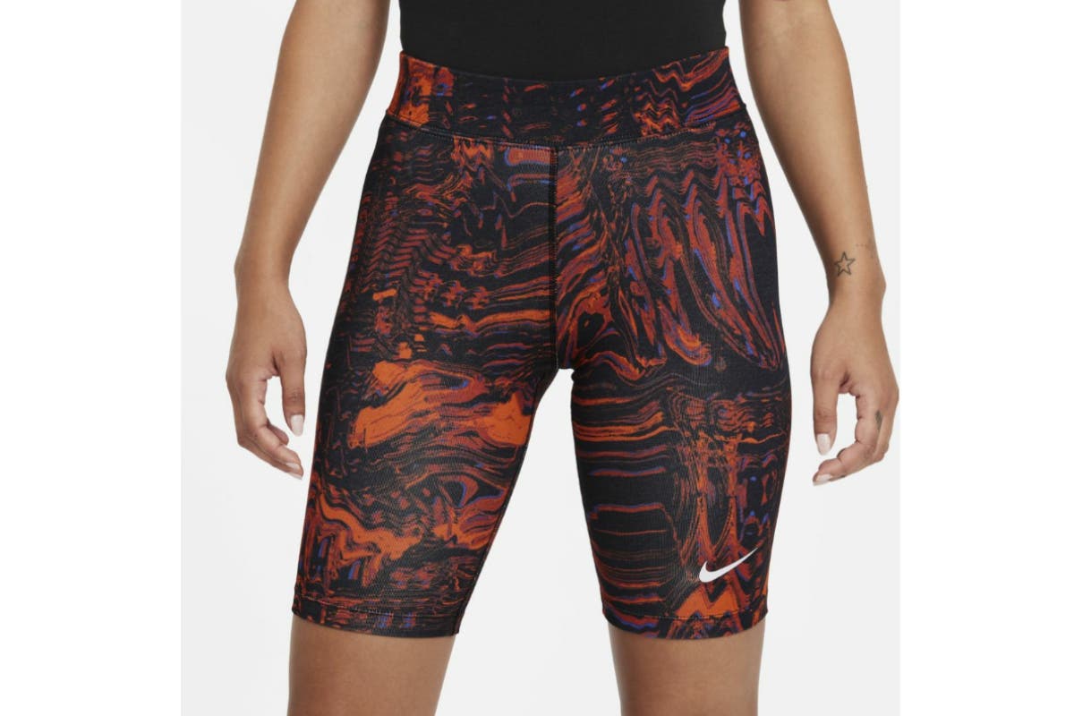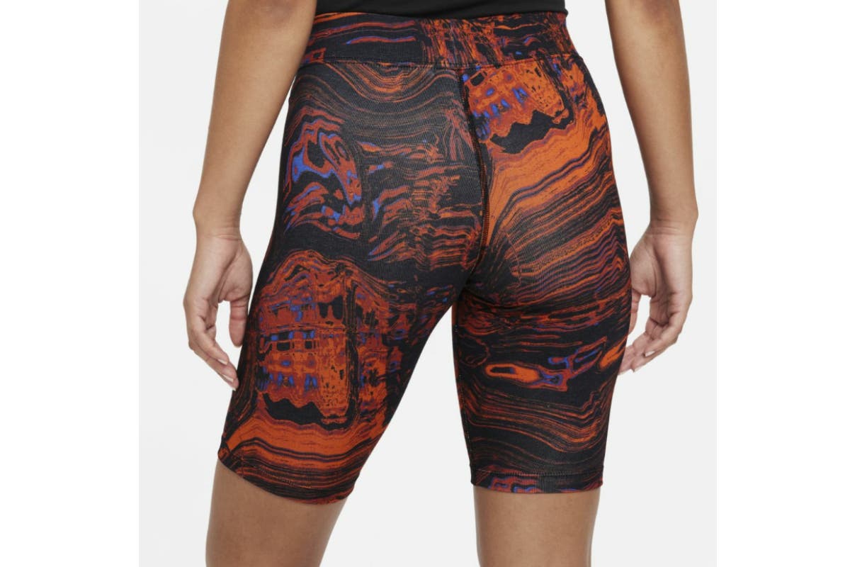 Nike Women’s Nike Sportswear Essential All Over Print Shorts’ retro style brings the energy, updated with a bold and bright pattern. Stretchy, sweat-wicking fabric and a Swoosh logo make these an easy choice for everyday wear.