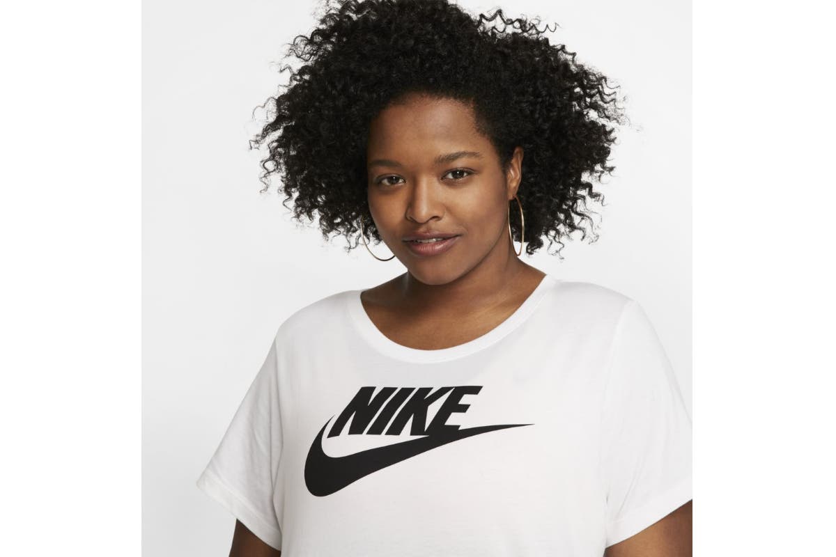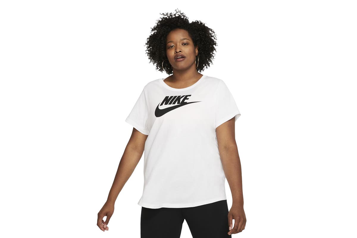 The Nike Women’s Nike Sportswear Essential Futura Plus Tee sets you up with a soft cotton jersey feel in a tunic-like silhouette and a Nike graphic screen-printed on the chest.
