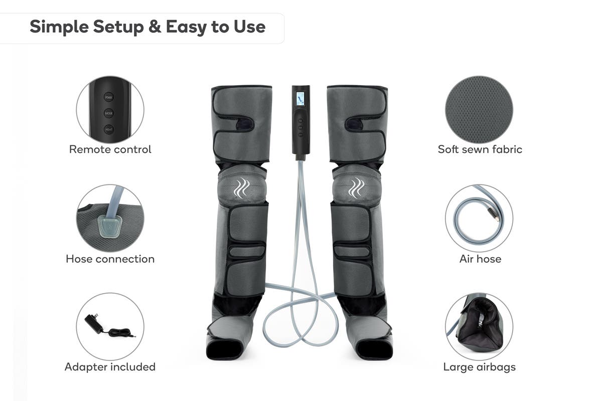 Enjoy for longer With a built-in LCD display and automatic shut-off function, you can easily control your massager and enjoy up to 15 minutes of continuous use. This massager is designed to provide relief to the muscles in your feet, calves, and thighs. It may also help improve circulation and reduce swelling and the appearance of varicose veins. You can choose from three intensity levels and three massage modes, and there is also a heat function for additional comfort. The massager has adjustable straps to ensure a snug, comfortable fit, and an LCD display for easy control. It will automatically shut off after 15 minutes of use.