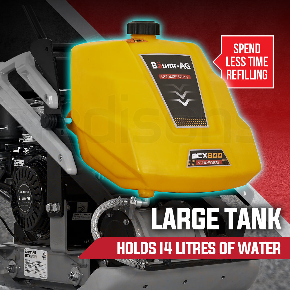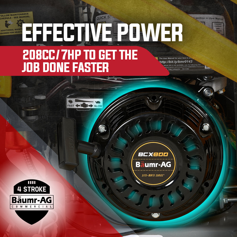 Take one look at the Baumr-AG BCX-800 Site-Mate Series Plate Compactor and it's plain to see that this is a truly next generation design. With high-tech manufacturing employed from the ground up, the BCX-800 is of course precision robot-welded to provide maximum strength and inhibit rust. Encased in the protective frame is a class-leading easy-start air-cooled 7HP 4-Stroke engine that is tough, reliable and efficient.
