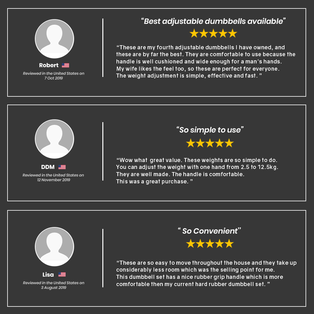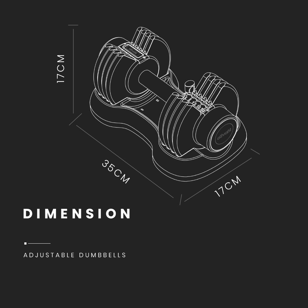 Giving you the versatility of 5 sets of standard dumbbells, your Ativafit® set saves you on the initial outlay cost as well as being much more compact to store! With superior design and build quality, it should come as no surprise that Ativafit® are leaders in the U.S. market. While other adjustable dumbbell models have a plastic locking system, Ativafit® utilises a secure high-tensile steel design.